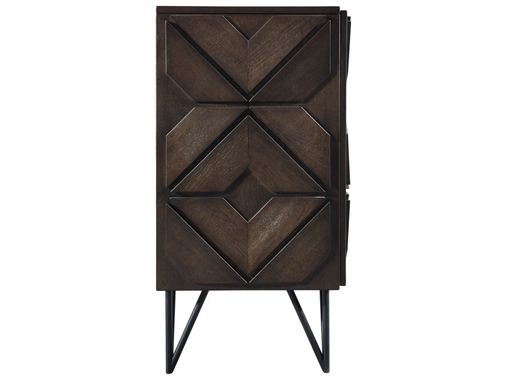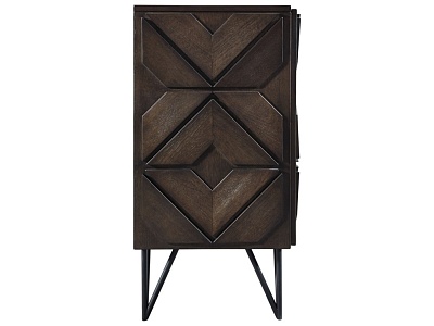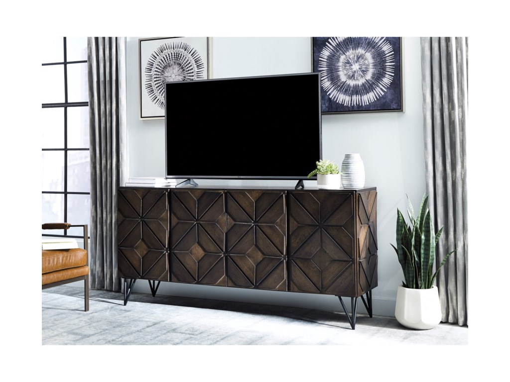 ASHLEY комод CHASINFIELD ( коллекция AMERICAN LIFESTYLE) .Стиль: американский Modern.Тип: акцентный комод( ТВ стенд вмещает телевизор до 75 дюймов) для гостиной,три шкафа,три закрытые регулируемые полки, вырезы для проводов.Цвет: коричневый.Отделка: шпон манго,геометрический дизайн,металлические ножки.Размеры,мм:ш.1848/г.457/в.876.