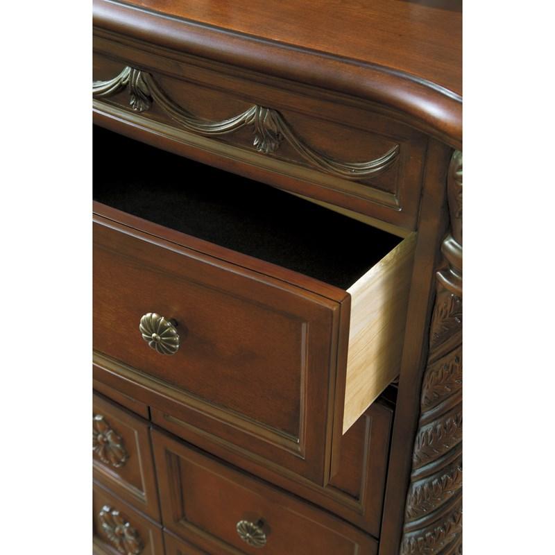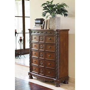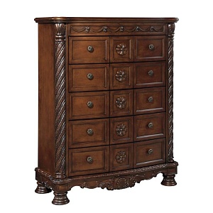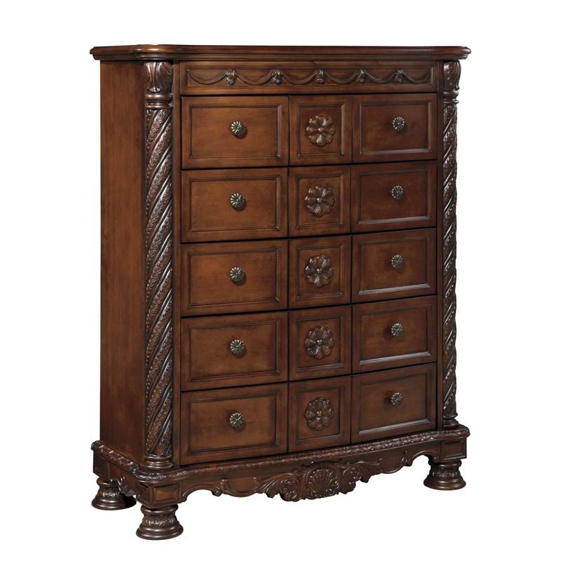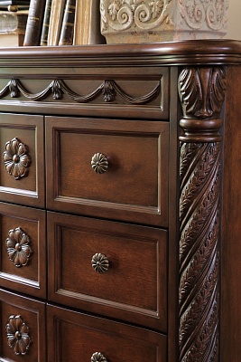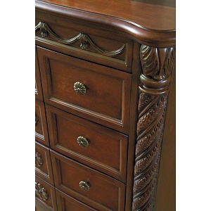 ASHLEY комод NORTH SHORE(коллекция AMERICAN LIFESTYLE).Стиль: американский Traditional.Тип: комод для спальни высокий с пятью выдвижными ящиками,верхний обит фетром.Цвет:тёмно-коричневый.Отделка:кедровый шпон,акцентированные детальные орнаментальные аппликации из литой смолы,антикварная бронзовая металлическая фурнитура.Размеры,мм:ш.1137/г.483/в.1378.