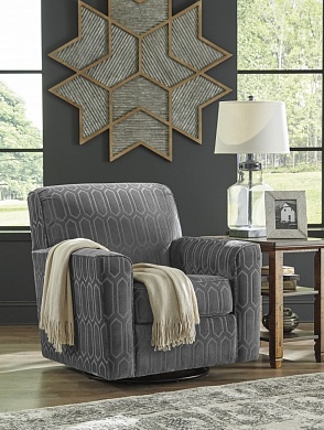 ASHLEY кресло ZARINA ( коллекция AMERICAN LIFESTYLE).Стиль: американский Urbanology.Тип: поворотное( 360 град.) акцентное кресло, с рельефным геометрическим дизайном, открытыми ножками и свободной подушкой.Цвет: тёмно-серый( графит).Обивка: сложнофактурная ткань,100% полиэстер,категория высшая,одобрена по высоким американским стандартам качества AHFA( износостойкость,долговечность).Размеры,мм: ш.914/г.991/в.914.
