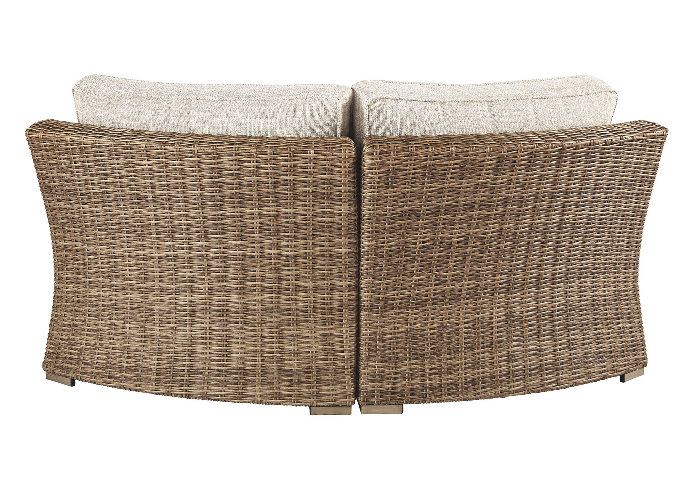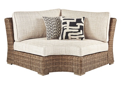 ASHLEY кресло секционное для улицы BEACHCROFT ( коллекция AMERICAN LIFESTYLE). .Стиль: американский Vintage Casual .Тип: кресло секционное для улицы с закруглённым углом каркасом из алюминия и двумя декоративными подушками в комплекте,совместимо с другими предметами этой серии .Цвет: бежевый .Обивка: высокоэффективная неприхотливая в уходе ткань от Nuvella,100% полиэстер,категория высшая,одобрена по высоким американским стандартам качества AHFA(износостойкость,долговечность),всепогодный пенный наполнитель подушек.Отделка: прутья из эпоксидной смолы . Размеры,мм:ш.1829/г.1041/в.965.