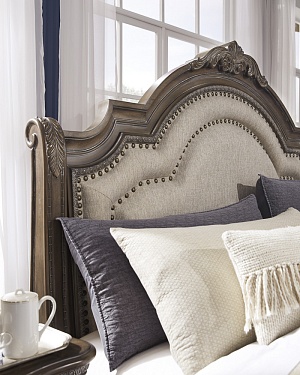 ASHLEY кровать KING/QUEEN SIZE CHARMOND( коллекция AMERICAN LIFESTYLE).Стиль:американский Grand Elegance.Тип:кровать двуспальная,размер спального места,мм: ш.1950/г.2050(KING);ш.1550/г.2050(QUEEN),ортопедическая решётка и матрас в стоимость не входят. Цвет:бежевый,коричневый с белыми бликами.Обивка:изголовье мягкое, сложнофактурная ткань 100% полиэстер,категория высшая,одобрена по высоким американским стандартам качества AHFA(износостойкость,долговечность).Отделка:патинированный шпон дуба,декоративные гвозди,декоративные элементы из литой смолы .Размеры,мм:ш.2134/г.2057/в.1828(KING);ш.1728/г.2057/в.1828(QUEEN).