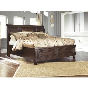 ASHLEY кровать QUEEN SIZE PORTER (коллекция AMERICAN LIFESTYLE).Стиль: американский Casual.Тип: кровать сани двуспальная,с двумя ящиками для хранения и жёстким изголовьем, матрас, в стоимость не входит.Цвет: коричневый.Отделка: шпон вишни; инкрустированные панели; антикварная металлическая фурнитура.Размеры,мм,ш.1640/г.2300/в.1370.