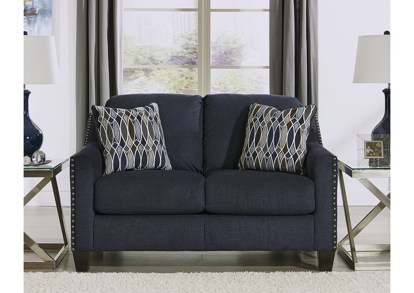 ASHLEY диван 2-М CREEAL HEIGHTS( коллекция AMERICAN LIFESTYLE).Стиль: американский Contemporary Living.Тип: диван двухместный нераскладной с двумя декоративными подушками в комплекте.Цвет: тёмно-синий.Обивка: сложнофактурная ткань,100% полиэстер,одобрена по высоким американским стандартам качества AHFA( износостойкость,долговечность).Отделка: металлические мебельные гвозди.Размеры,мм: ш.1448/г.914/в.940.