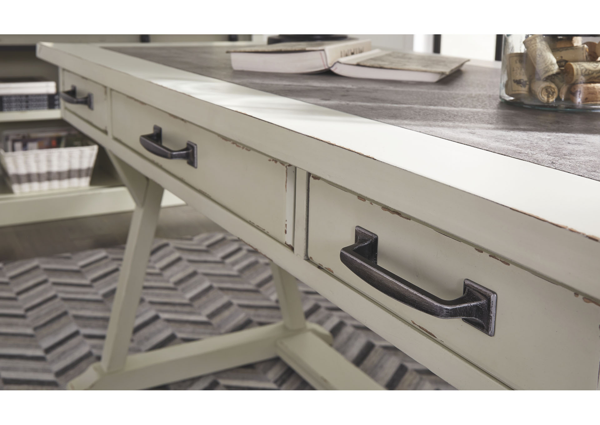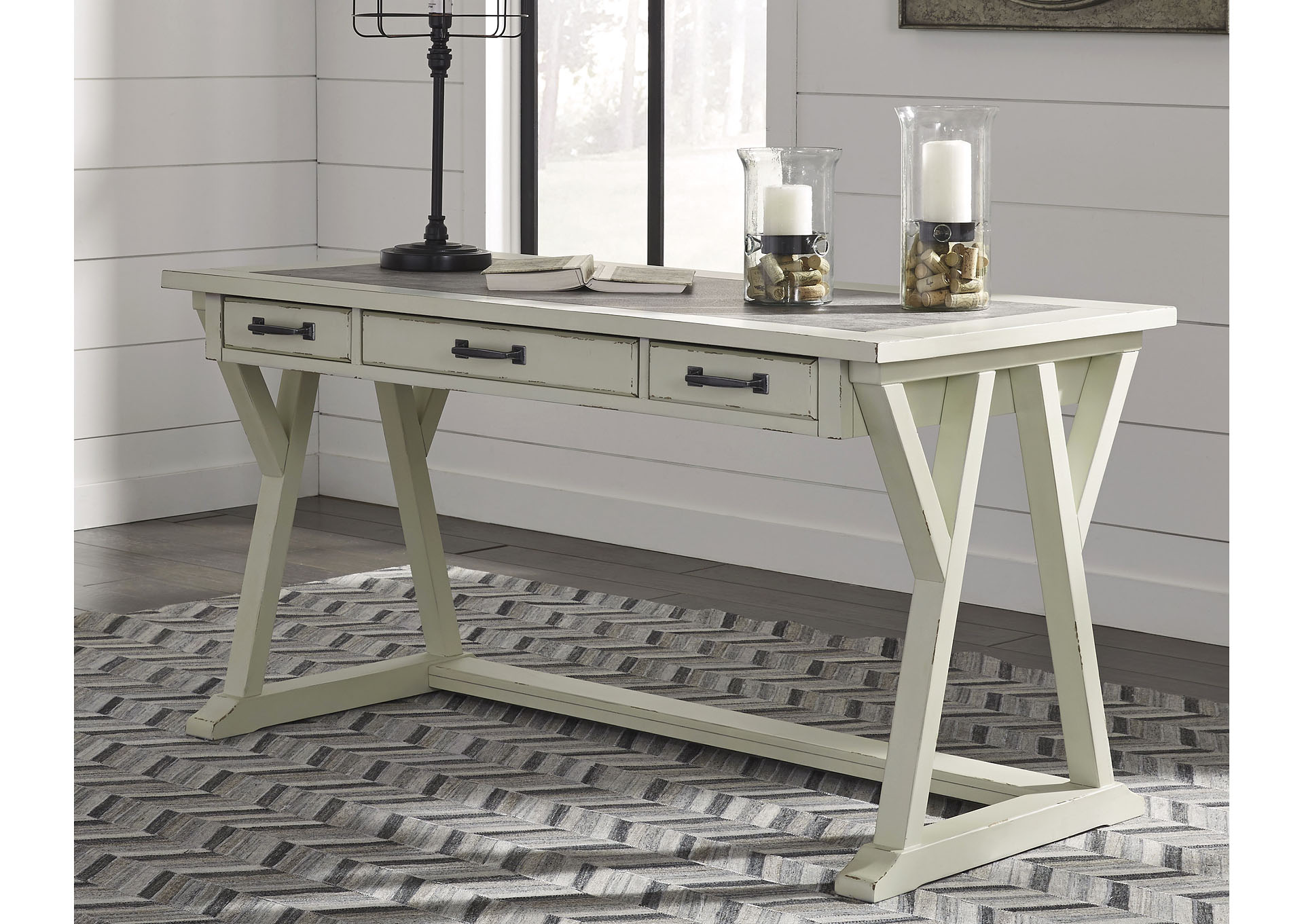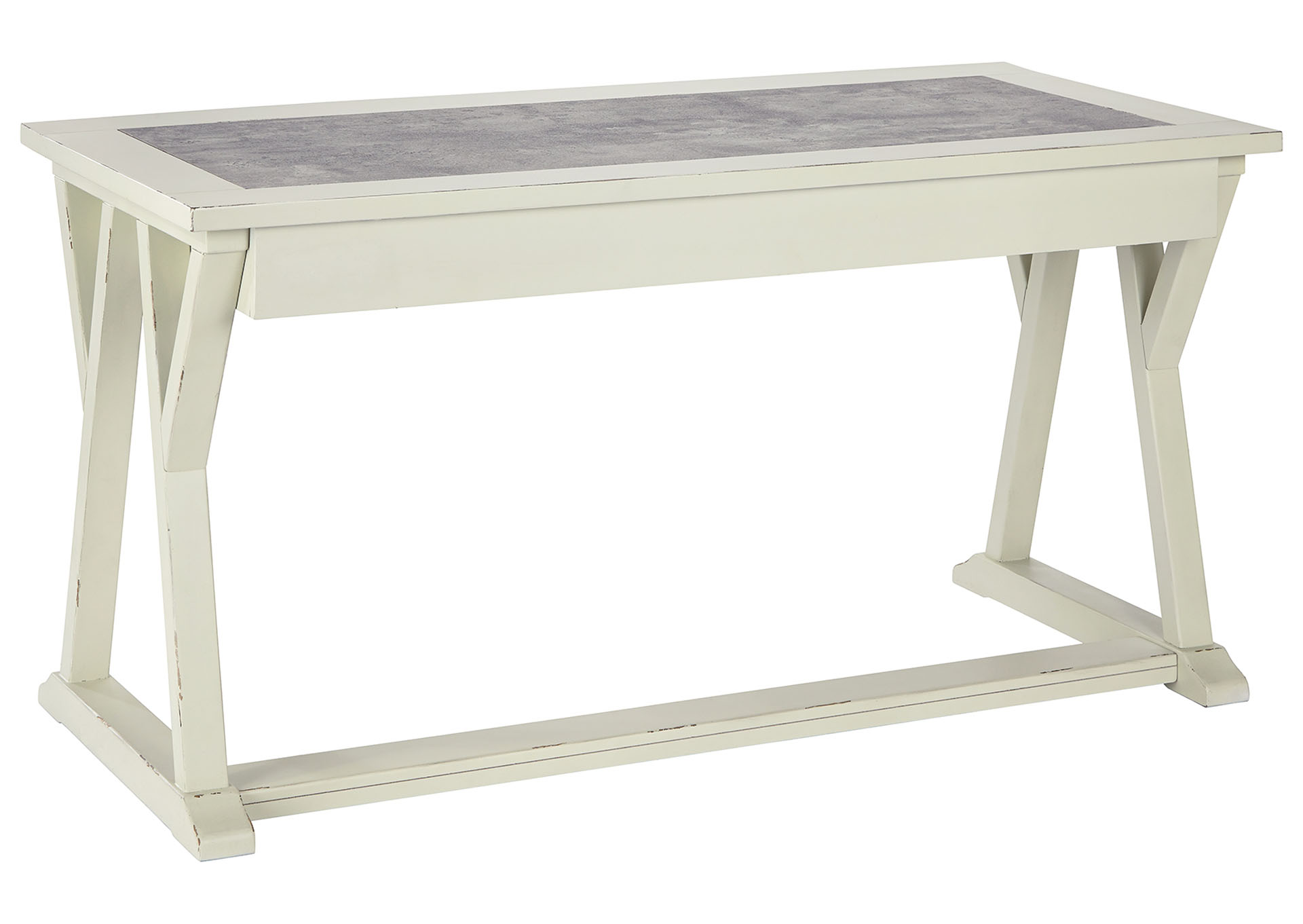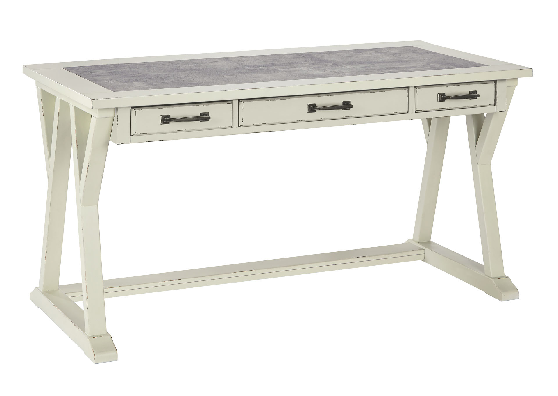 ASHLEY стол JONILEENE (коллекция AMERICAN LIFESTYLE).Стиль: американский Vintage Casual.Тип: кабинетный письменный стол с тремя выдвижными ящиками.Цвет: белый/серый.Отделка: двухцветная искусственно состаренная; верх столешницы из искусственного" цемента"; тёмно-серая металлическая фурнитура.Размеры,мм:ш.1524/г.711/в.772.