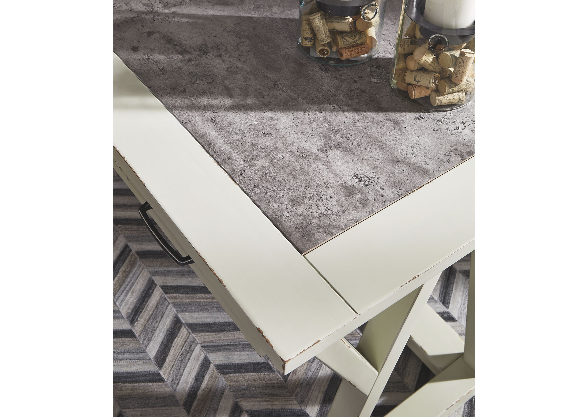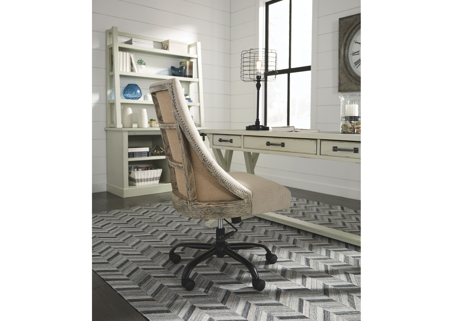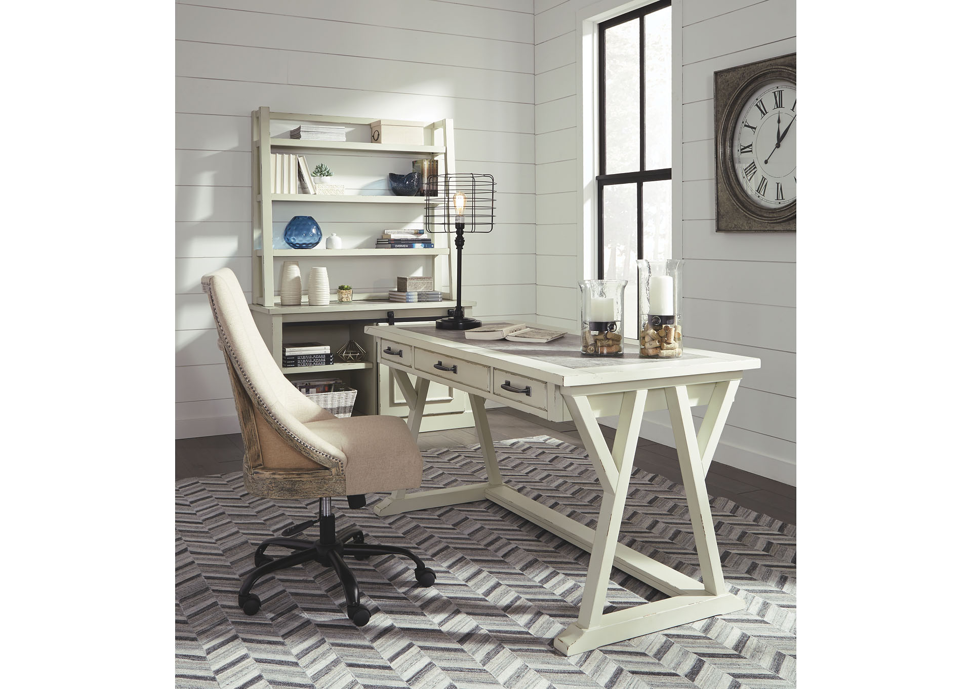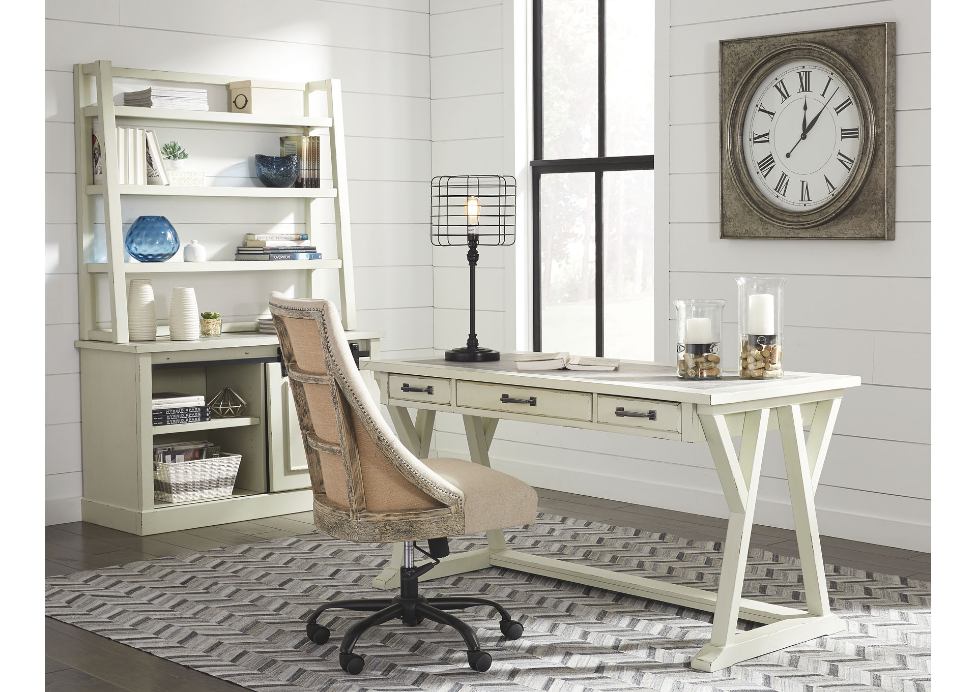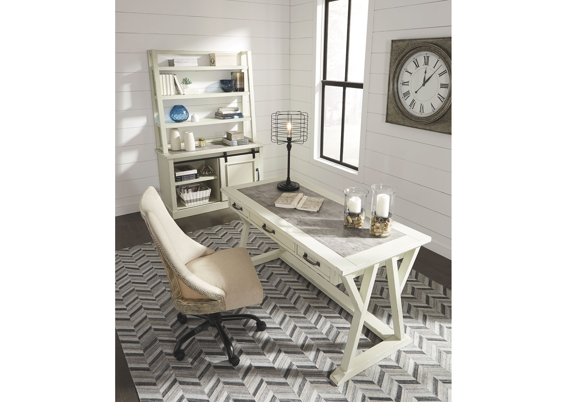 ASHLEY стол JONILEENE (коллекция AMERICAN LIFESTYLE).Стиль: американский Vintage Casual.Тип: кабинетный письменный стол с тремя выдвижными ящиками.Цвет: белый/серый.Отделка: двухцветная искусственно состаренная; верх столешницы из искусственного" цемента"; тёмно-серая металлическая фурнитура.Размеры,мм:ш.1524/г.711/в.772.