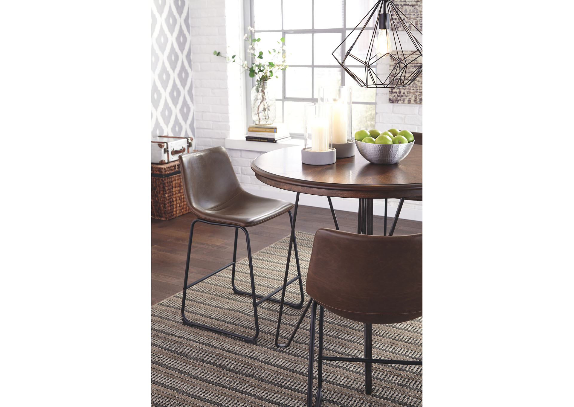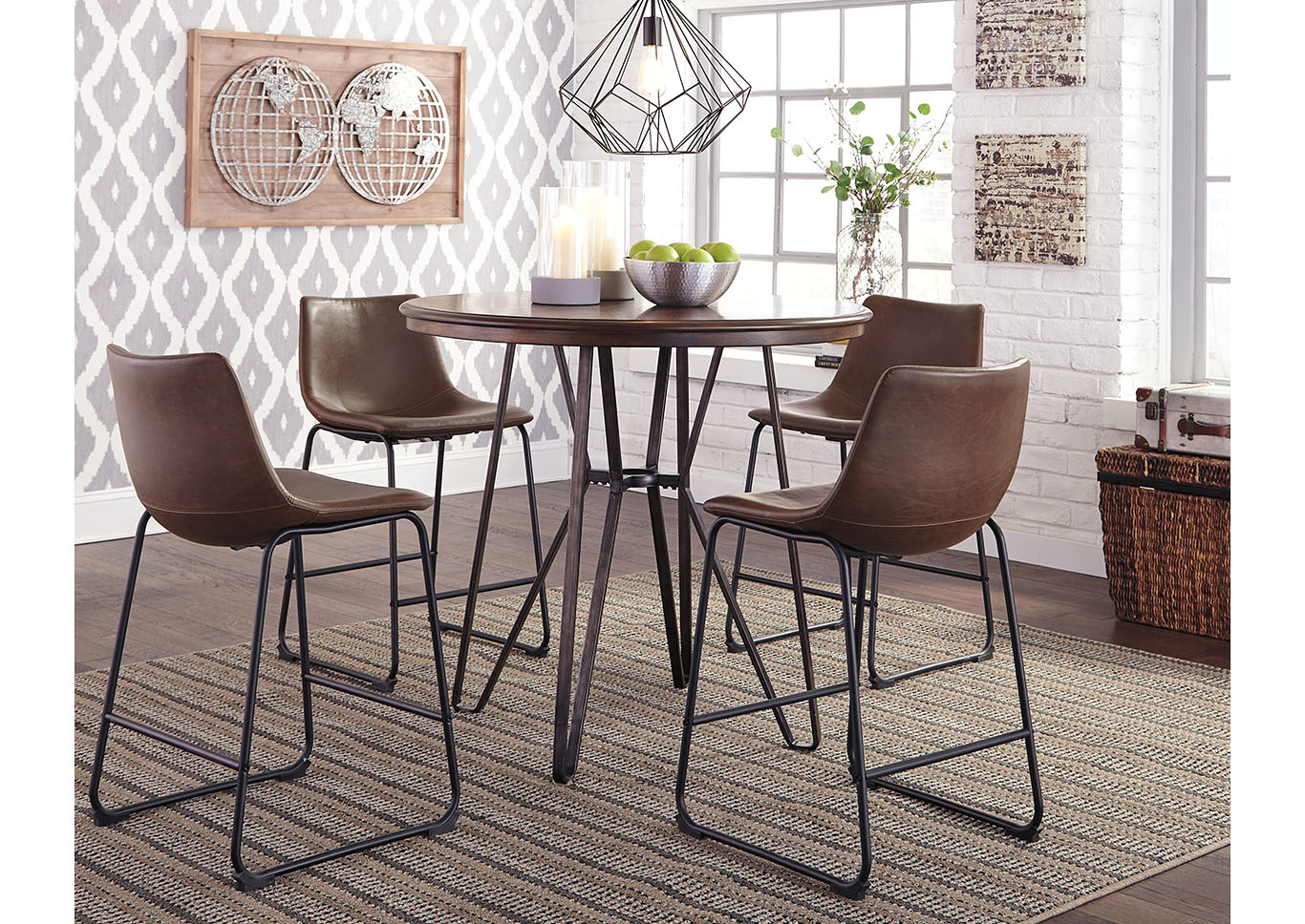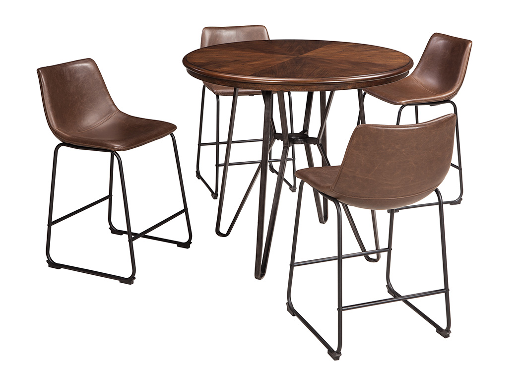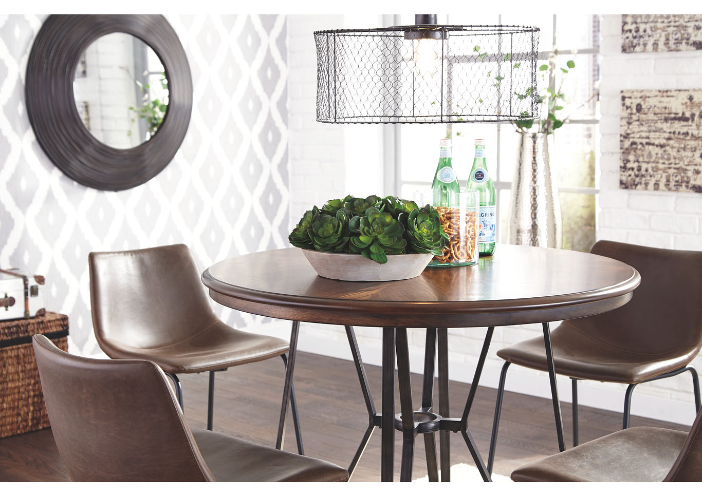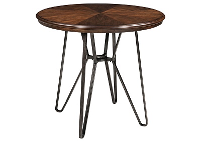 ASHLEY стол CENTIAR( коллекция AMERICAN LIFESTYLE).Стиль: американский Casual .Тип: круглый, барный стол, с трубчатой металлической основой.Цвет: коричневый/бронзовый.Отделка: матовая тёмная бронза;столешница шпон минди( минлаль).Размеры,мм: ш.1020/г.1020/в.920.