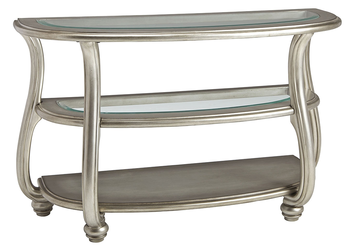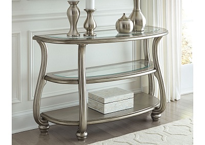 ASHLEY стол CORALAYNE (коллекция AMERICAN LIFESTYLE).Стиль:американский Traditional .Тип: консольный стол с двумя открытыми фиксированными полками,верхняя и средняя из прозрачного термостекла.Цвет:серебро.Отделка:патинированный металлический блеск.Размеры,мм:ш.1219/г.483/в.762.