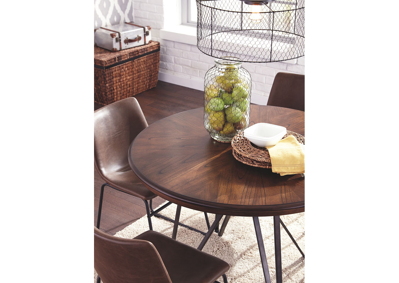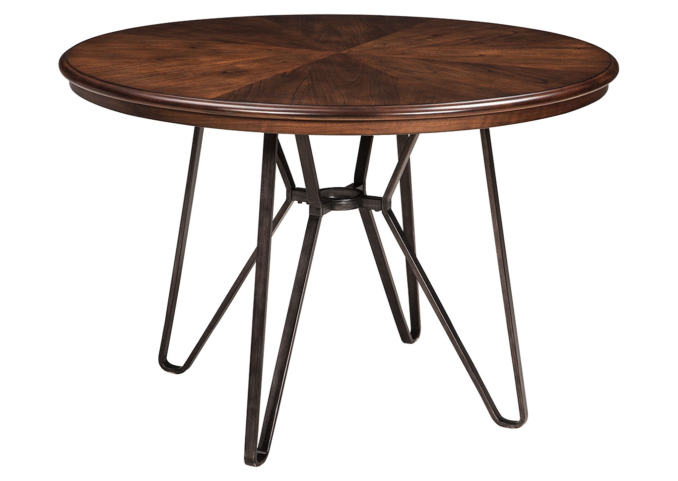ASHLEY стол CENTIAR( коллекция AMERICAN LIFESTYLE).Стиль: американский Casual .Тип: круглый, обеденный нераскладной стол, с трубчатой металлической основой.Цвет: коричневый/бронзовый.Отделка: матовая тёмная бронза;столешница шпон минди( минлаль).Размеры,мм: ш.1153/г.1153/в.775.