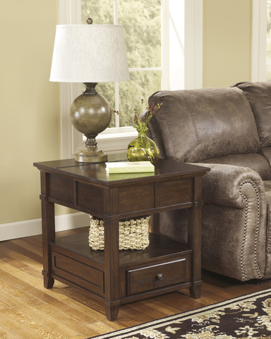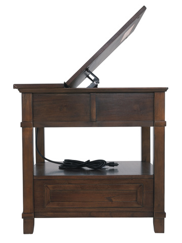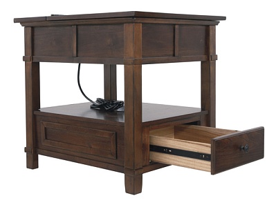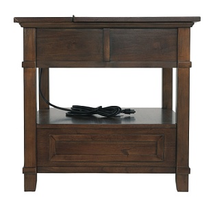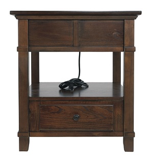 ASHLEY стол GATELY (коллекция AMERICAN LIFESTYLE).Стиль: американский Casual.Тип: прямоугольный приставной стол, с одним выдвижным ящиком; открытой полкой; откидная верхняя панель с местом для хранения и розетками питания.Цвет: коричневый.Отделка: рустикальная полированная; металлическая фурнитура тёмно-бронзового цвета.Размеры,мм:ш.610/г.690/в.660.