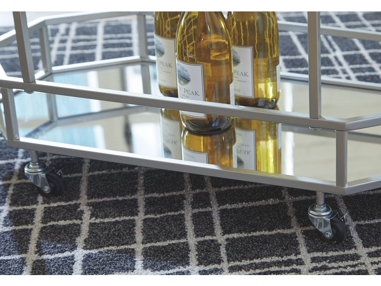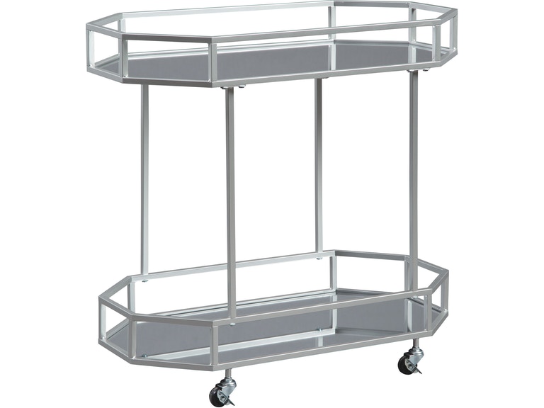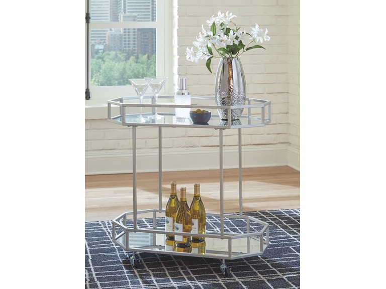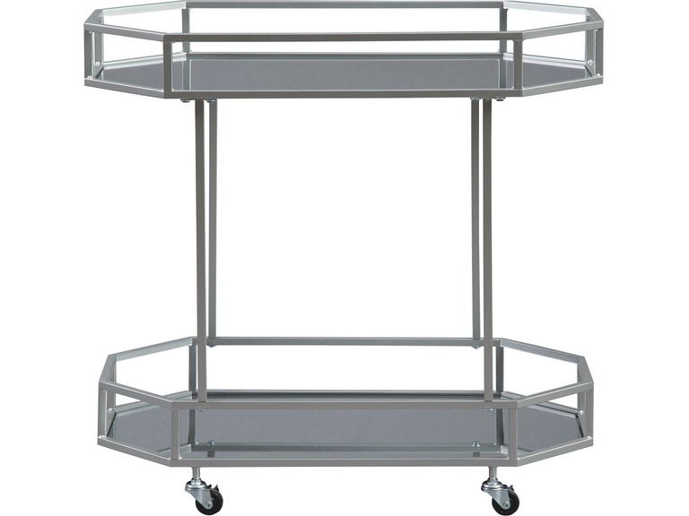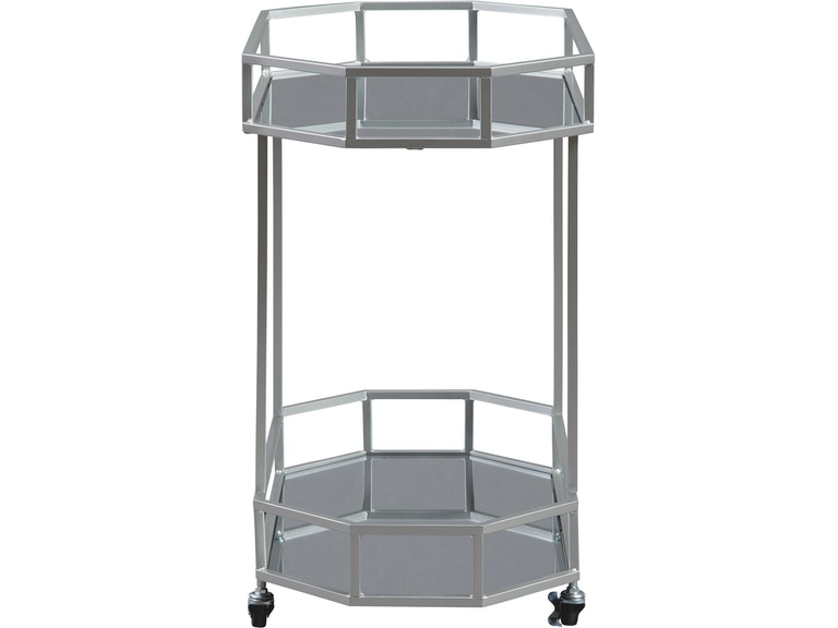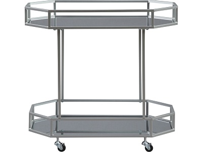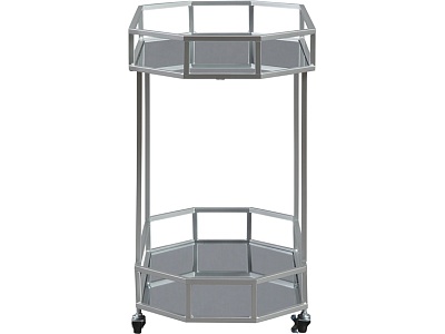 ASHLEY стол KADINBURG (коллекция AMERICAN LIFESTYLE).Стиль: американский Modern.Тип: акцентный восьмиугольный сервировочный стол с двумя зеркальными полками, на роликах.Цвет: серебряный.Отделка: античное серебро.Размеры,мм:ш.749/г.419/в.749.