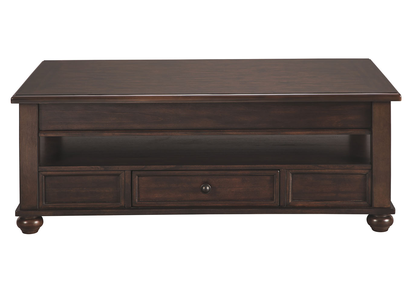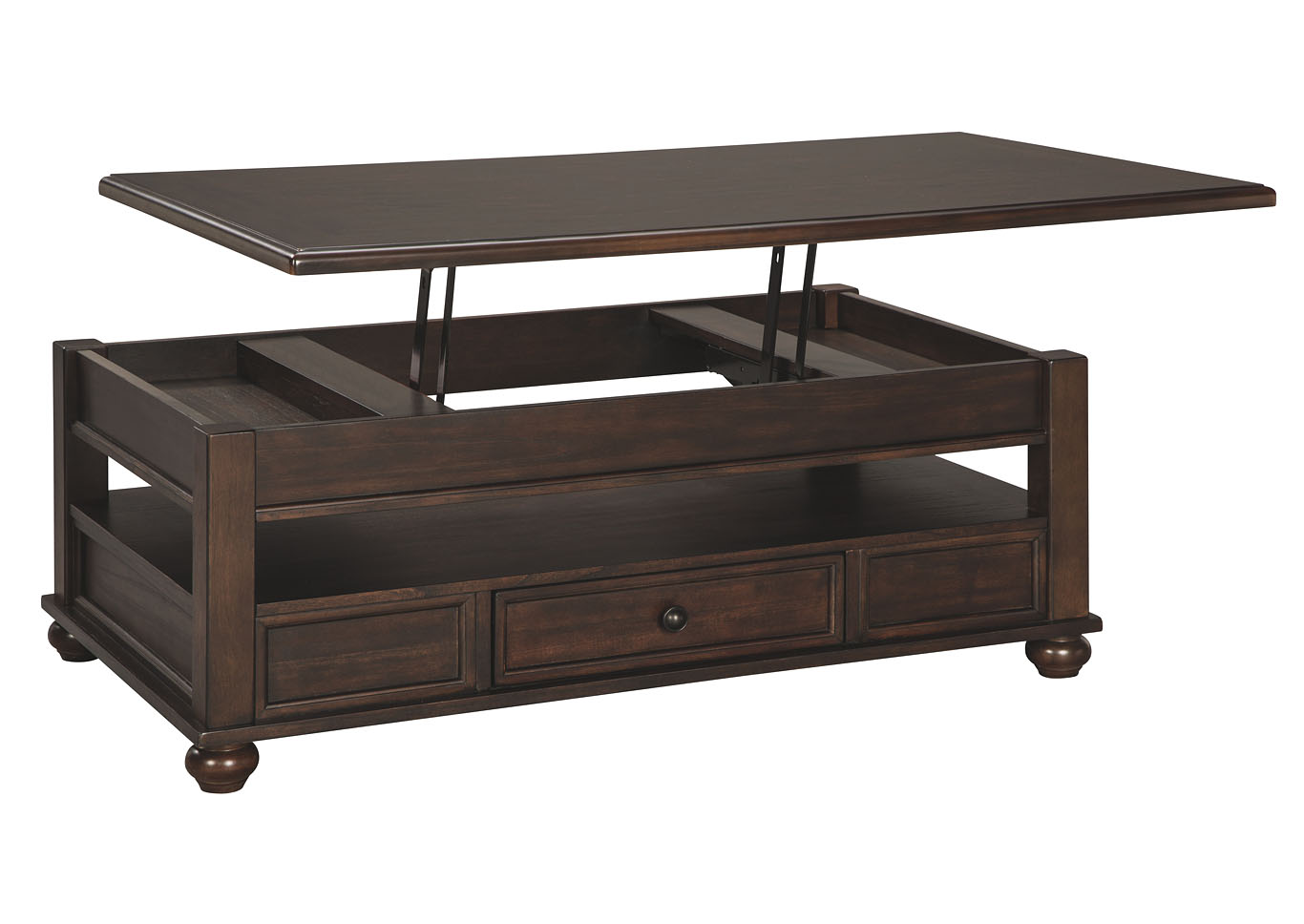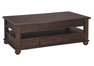 ASHLEY стол BARILANNI (коллекция AMERICAN LIFESTYLE).Стиль: американский Casual.Тип: прямоугольный журнальный стол трансформер с подъёмным механизмом со скрытым хранилищем, одним ящиком и одной открытой фиксированной полкой.Цвет: тёмно-коричневый.Отделка: металлическая фурнитура бронзового цвета.Размеры,мм:ш.1210/г.712/в.464.