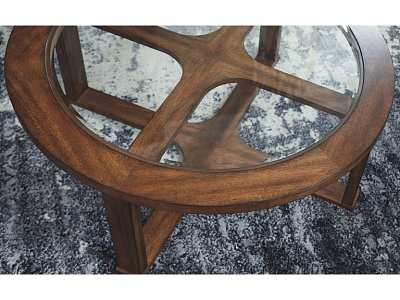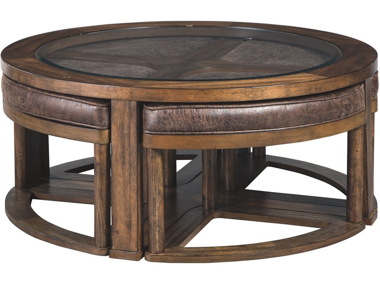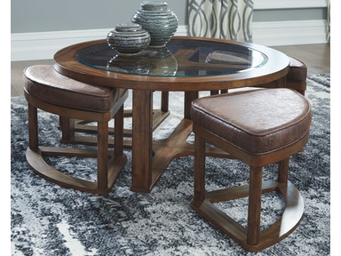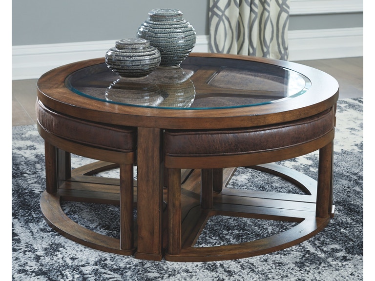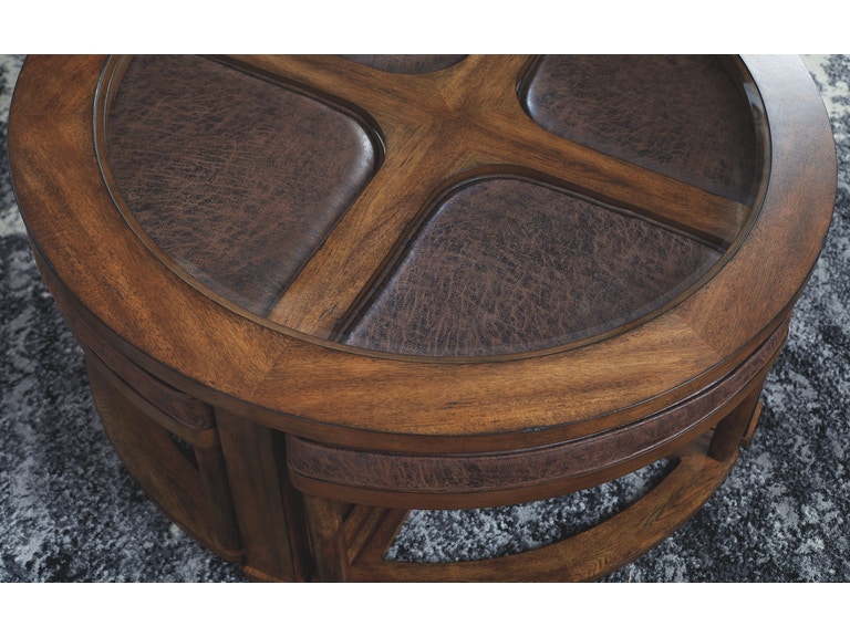 ASHLEY стол HANNERY (коллекция AMERICAN LIFESTYLE).Стиль: американский Casual.Тип: круглый журнальный стол с четырьмя клиновидными табуретами обитыми высококачественной экокожей.Цвет: коричневый.Отделка: глазурованный шпон акации; прозрачное термостекло.Размеры,мм: ш.1019/г.1019/в.425.