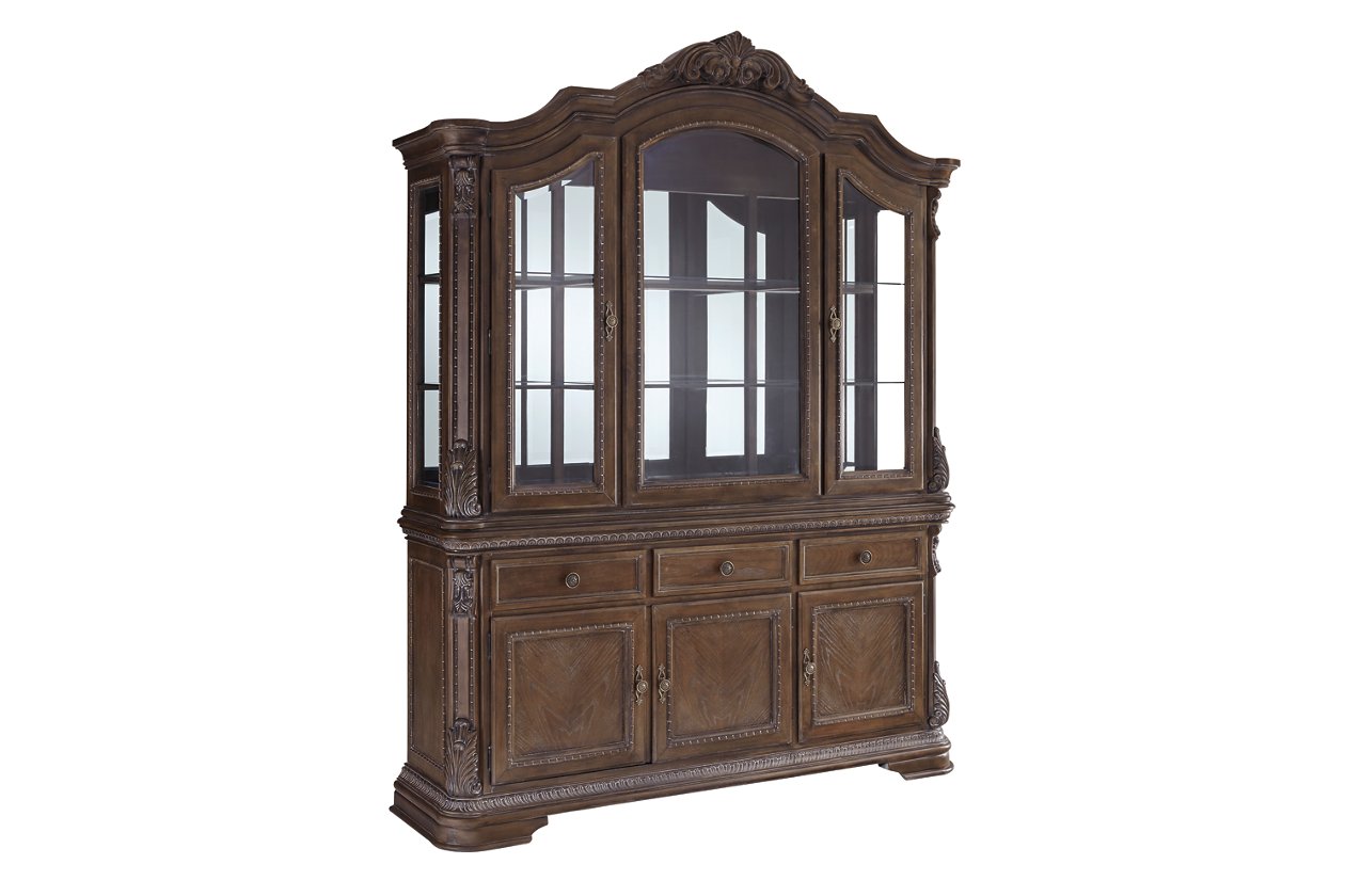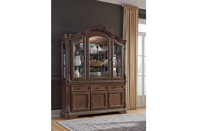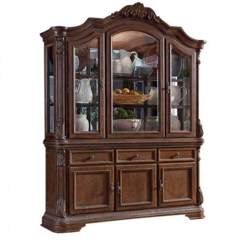 ASHLEY витрина CHARMOND(коллекция AMERICAN LIFESTYLE).Стиль:американский Grand Elegance.Тип:витрина(буфет) для столовой,пять дверей,зеркальный шкаф с двумя стеклянными полками и трёхсторонним светом,два шкафа в буфете,каждый с одной регулируемой полкой,три выдвижных ящика.Цвет:коричневый с белыми бликами.Отделка:патинированный шпон дуба,акценты из литой смолы,бронзовая металлическая фурнитура.Размеры,мм:ш.1778/г.483/в.1422.