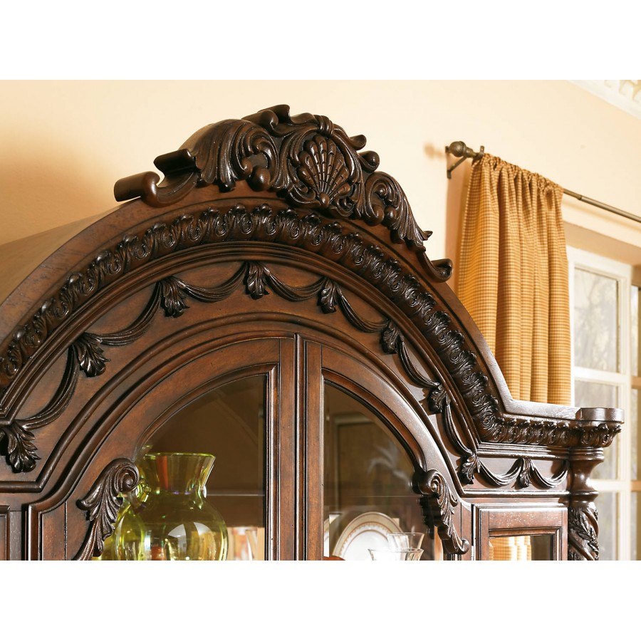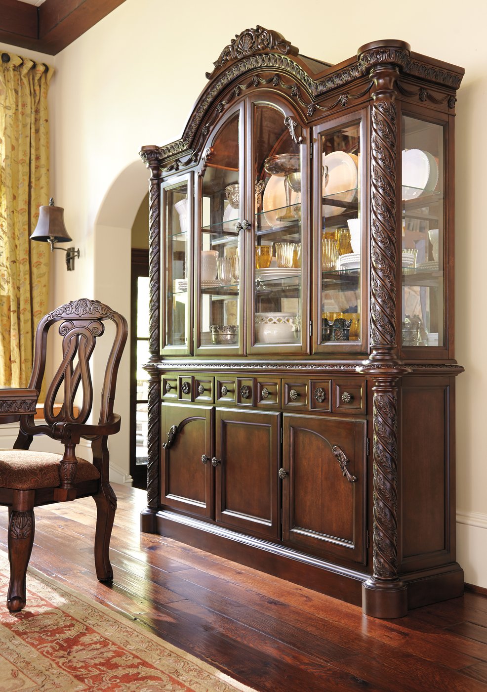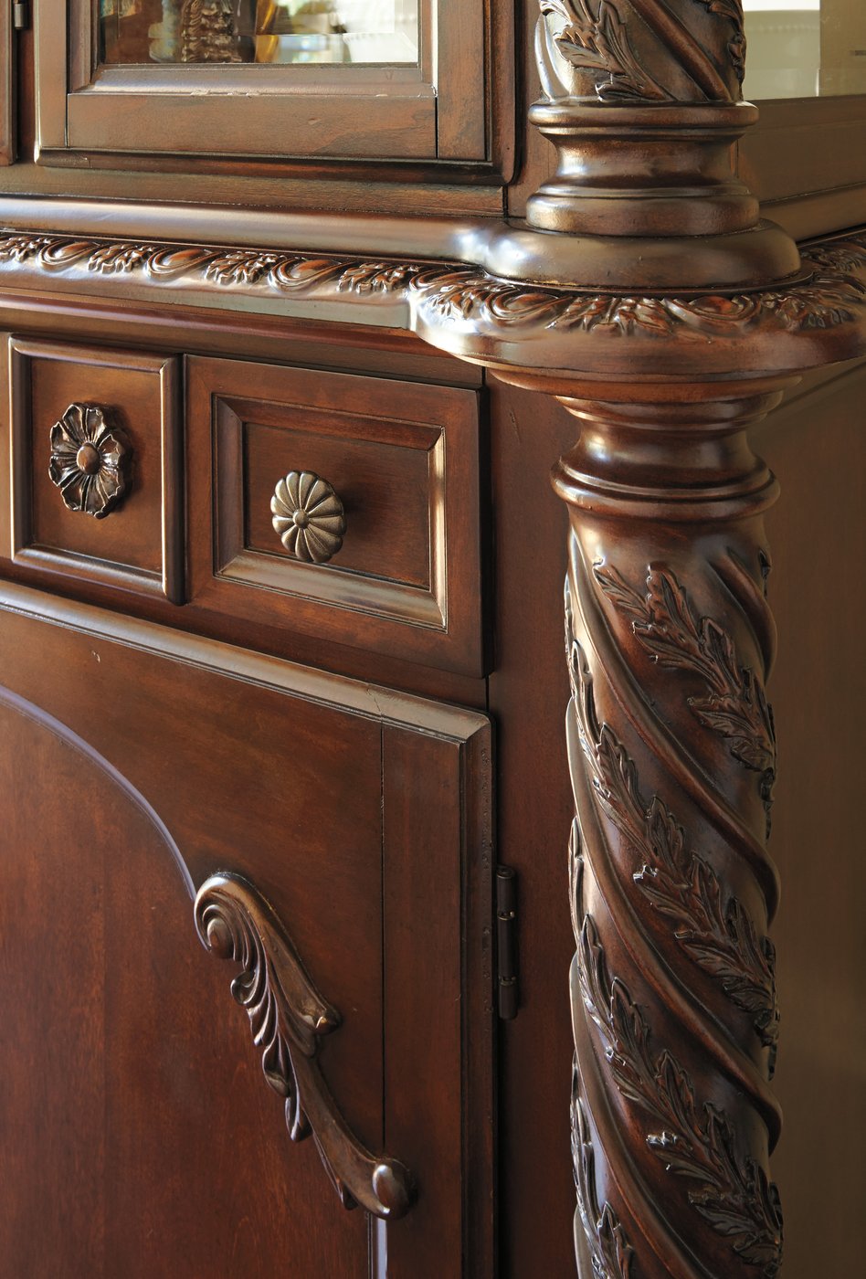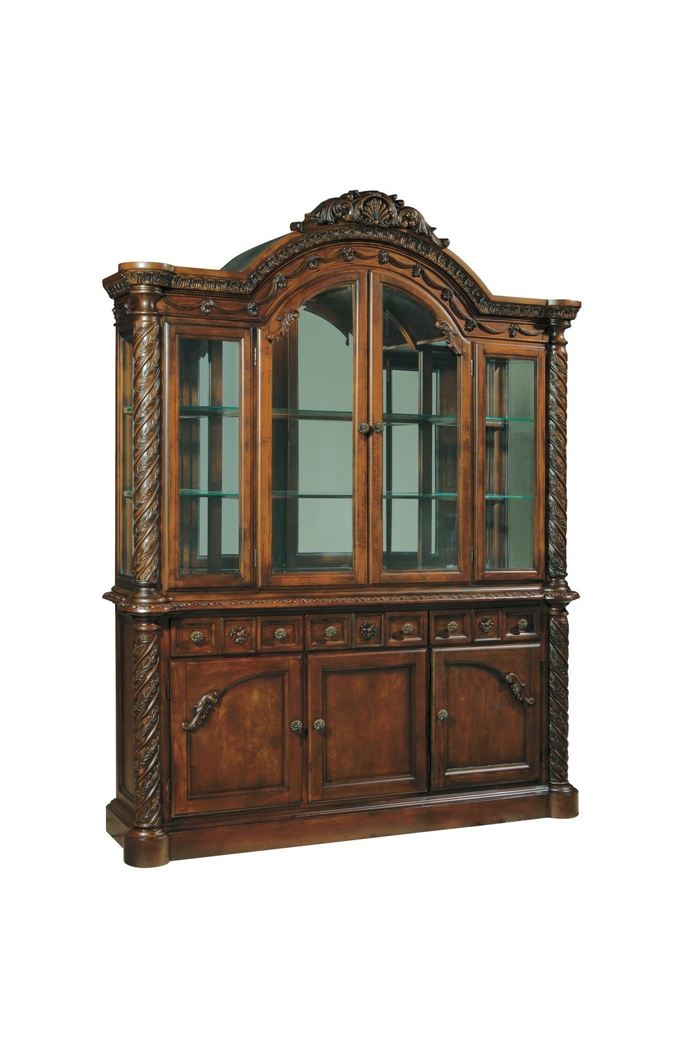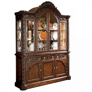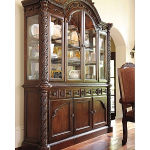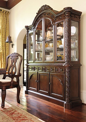 ASHLEY витрина NORTH SHORE(коллекция AMERICAN LIFESTYLE).Стиль:американский Traditional.Тип:витрина(буфет) для столовой c четырьмя шкафами, два из них зеркальные с трёхсторонним светом и подсветкой(светодиод) ,и тремя стеклянными полками;два шкафа в буфете,каждый с одной регулируемой полкой,три выдвижных ящика.Цвет: тёмно- коричневый.Отделка: кедровый шпон, акценты из литой смолы, антикварная бронзовая металлическая фурнитура.Размеры,мм:ш.1781/г.467/в.2305.
