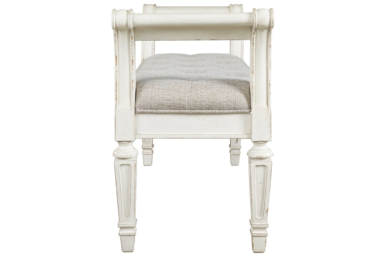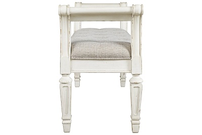 ASHLEY банкетка REALYN(AMERICAN LIFESTYLE).Стиль:американский Vintage Casual.Тип:акцентная скамья(банкетка) с мягким стёганным сиденьем.Цвет:слоновая кость,бежевый.Обивка:сложнофактурная ткань ,100% полиэстер,категория высшая,одобрена по высоким американским стандартам качества AHFA(износостойкость,долговечность).Отделка:антикварная,искусственно состаренная,патинированная и декорированная поверхность в технике"набрызг",и потёртость в технике"шебби шик",с элементами цветочной аппликации из литой смолы.Размеры,мм:ш.1168/г.413/в.657.