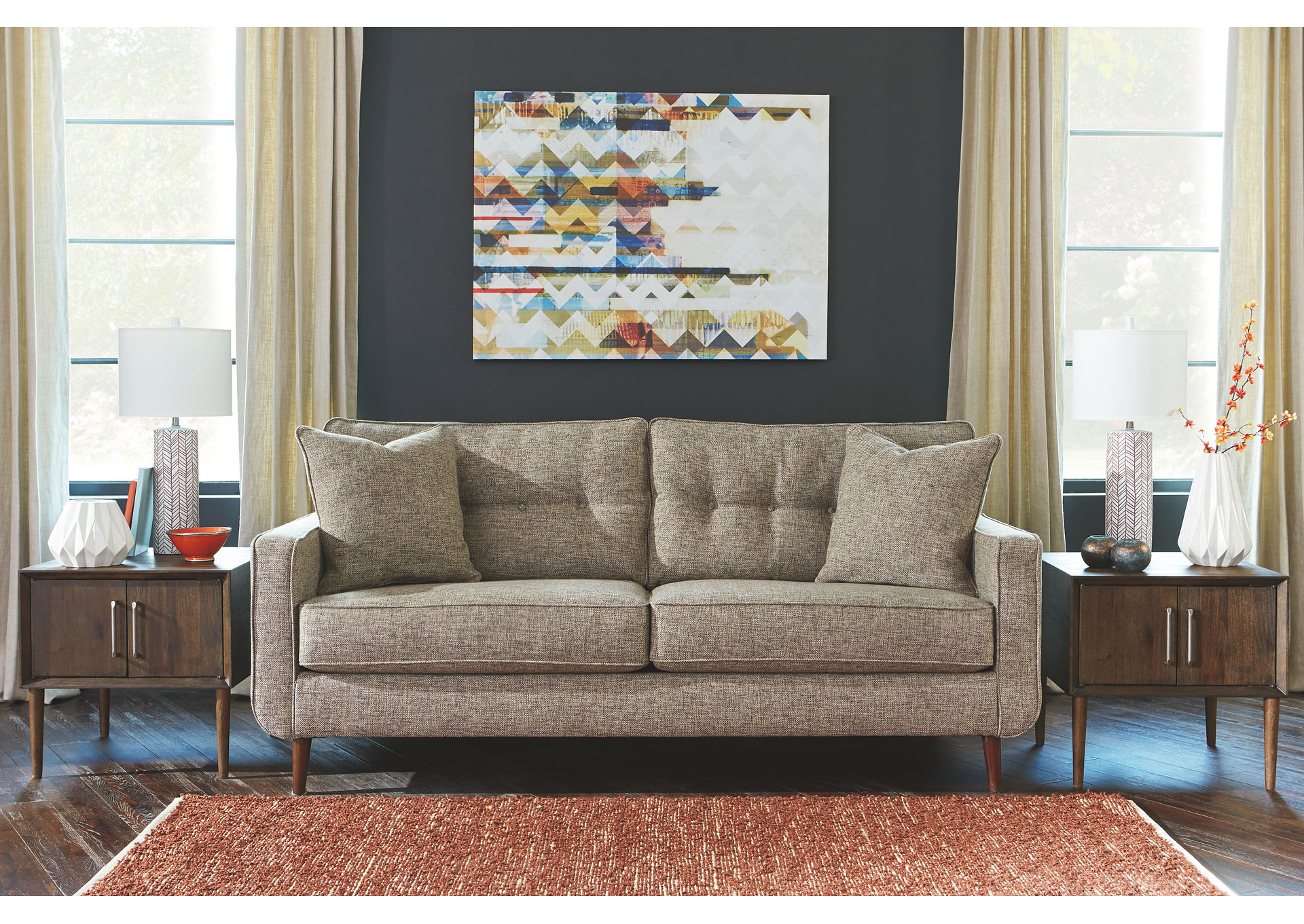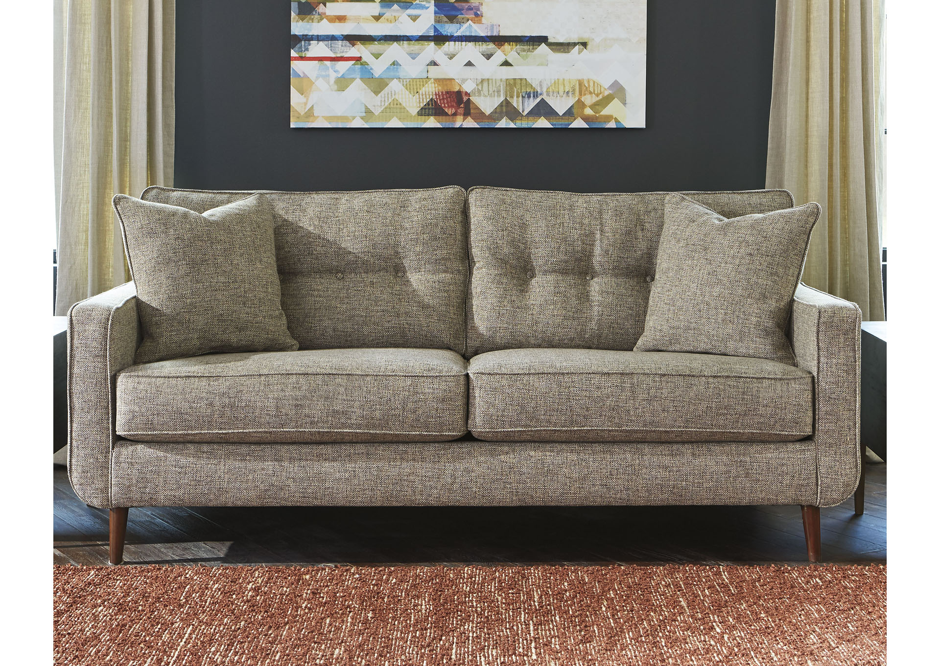 ASHLEY диван 3-М DAHRA (коллекция AMERICAN LIFESTYLE).Стиль: американский Modern.Тип: диван трёхместный нераскладной с открытыми ножками и двумя декоративными подушками в комплекте.Цвет: бежевый.Обивка: сложнофактурная ткань 100% полиэстер,категория высшая,одобрена по высокому американскому стандарту качества AHFA(износостойкость,долговечность).Отделка: стёжка капитоне.Размеры,мм:ш.2007/г.965/в.965.