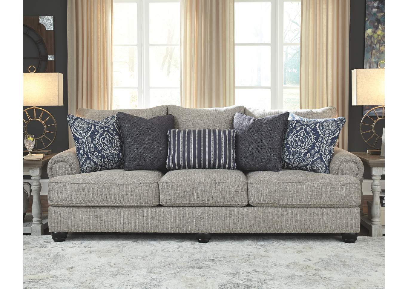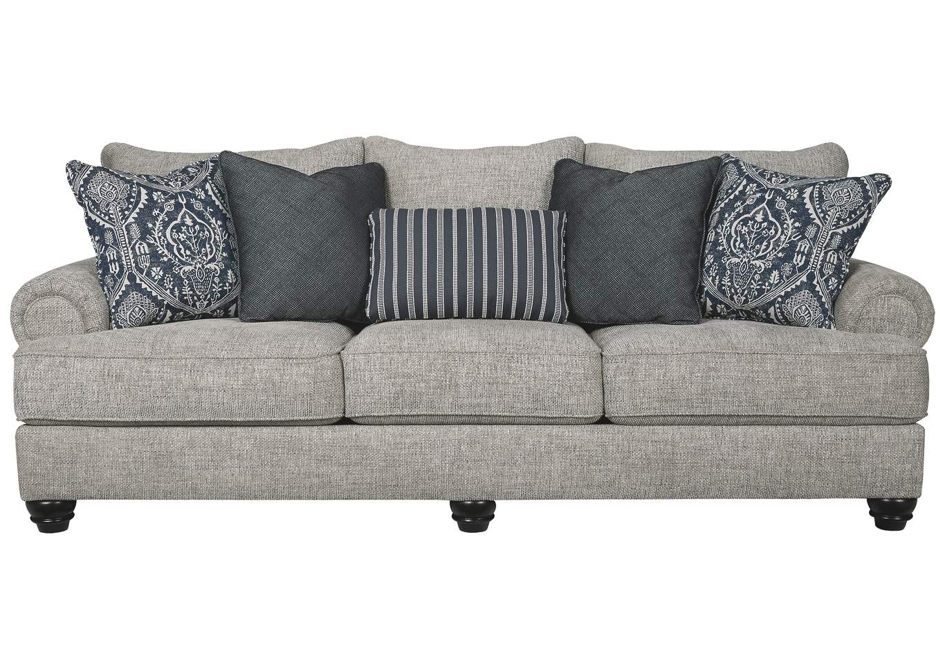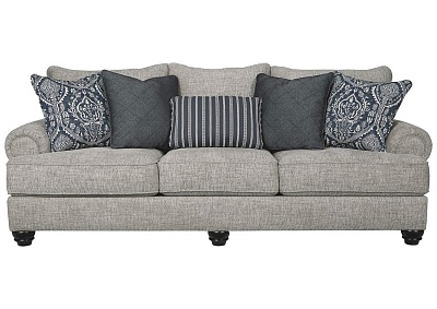 ASHLEY диван 3-М MORREN ( коллекция AMERICAN LIFESTYLE).Стиль:американский New Traditions.Тип: диван трёхместный нераскладной с пятью декоративными подушками в комплекте.Цвет: серый.Обивка: сложнофактурная ткань 100% полиэстер,категория высшая,одобрена по высоким американским стандартам качества AHFA( износостойкость,долговечность).Размеры,мм: ш.2464/г.1118/в.1067.