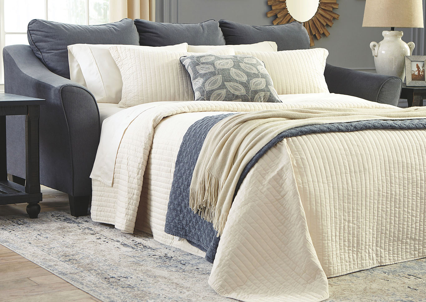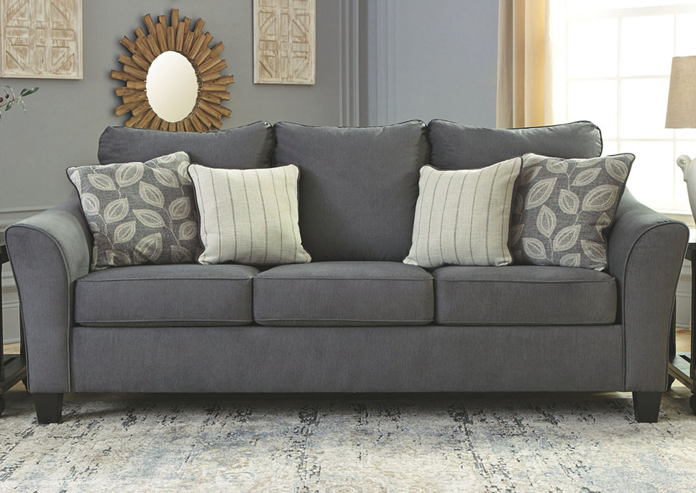 ASHLEY диван 3-М SANZERO ( коллекция AMERICAN LIFESTYLE).Стиль:американский Modern.Тип:диван-кровать с раскладным спальным механизмом"французская раскладушка" открытыми ножками и четырьмя декоративными подушками в комплекте, матрас размер(153/183/10),с высококачественным наполнителем Memory Foam( эффект памяти).Цвет: серый.Обивка: сложнофактурная ткань 100% полиэстер,категория высшая,одобрена по высоким американским стандартам качества AHFA( износостойкость,долговечность).Размеры,мм: ш.2337/г.1016/в.1041.