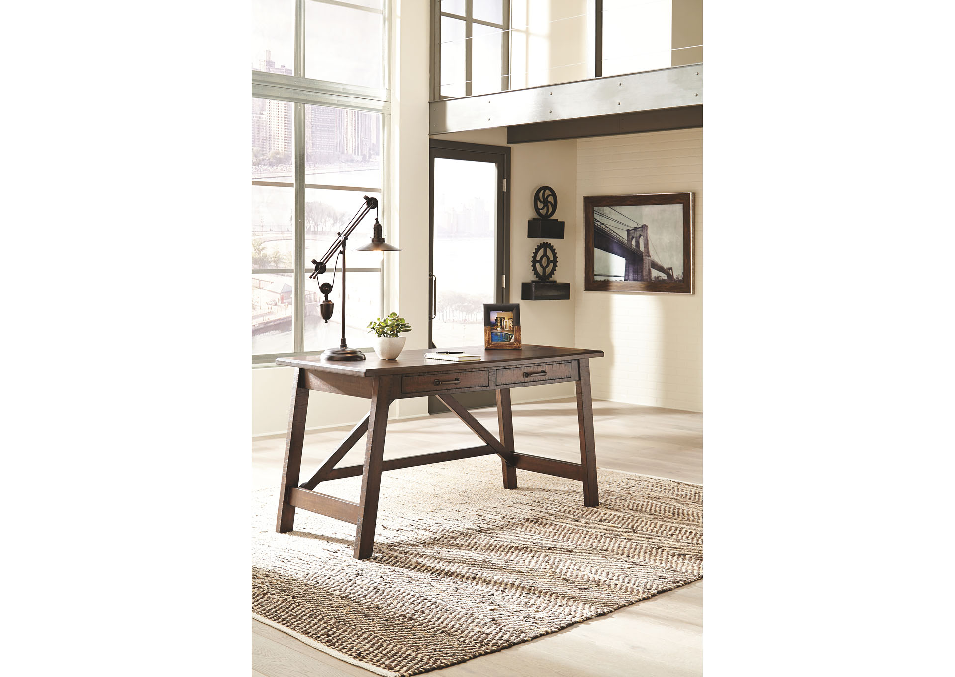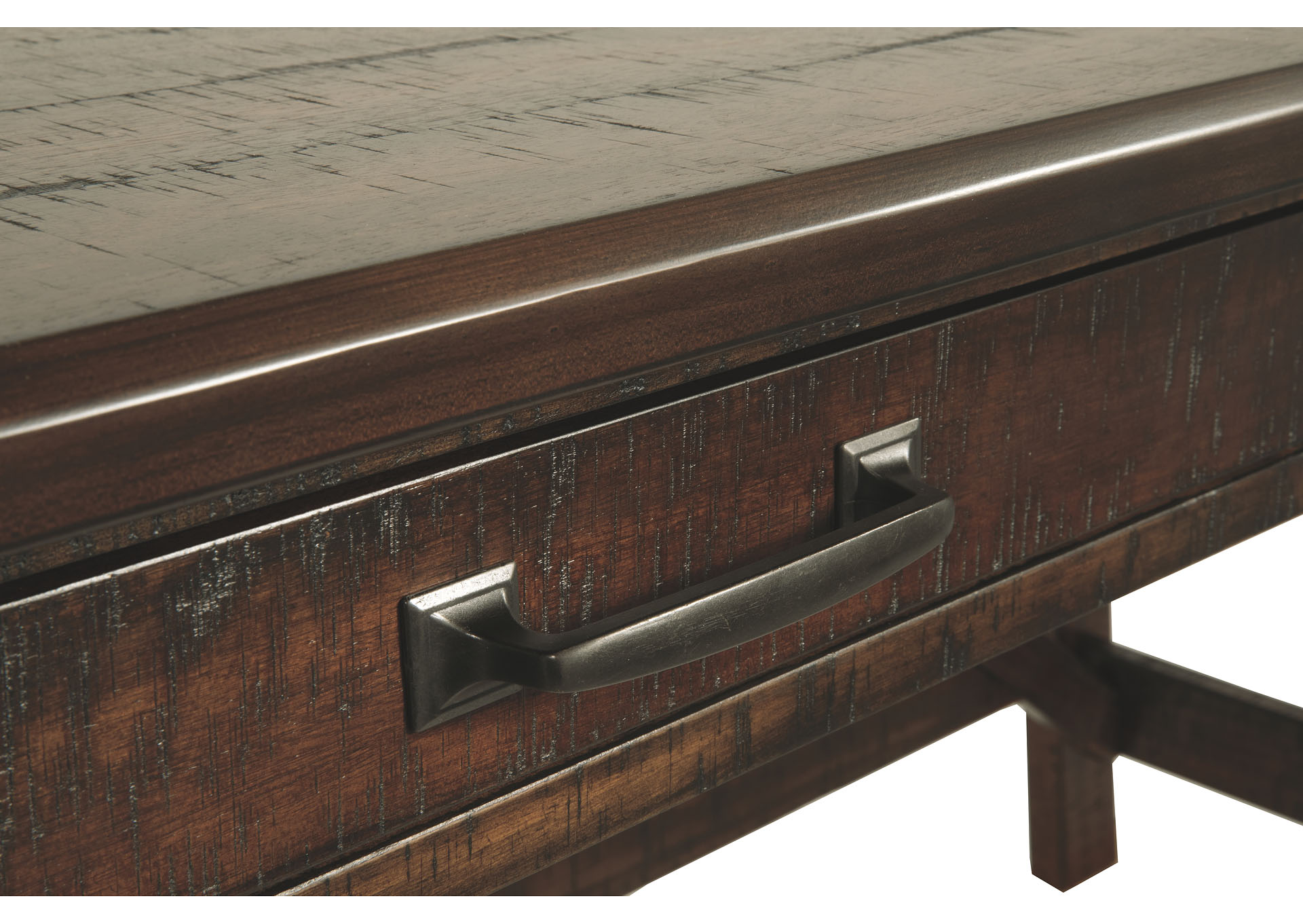 ASHLEY стол BALDRIDGE (коллекция AMERICAN LIFESTYLE).Стиль: американский Casual.Тип: кабинетный письменный стол с двумя выдвижными ящиками.Цвет: коричневый.Отделка: искусственно состаренная; антикварная металлическая фурнитура.Размеры,мм:ш.1524/г.660/в.791.