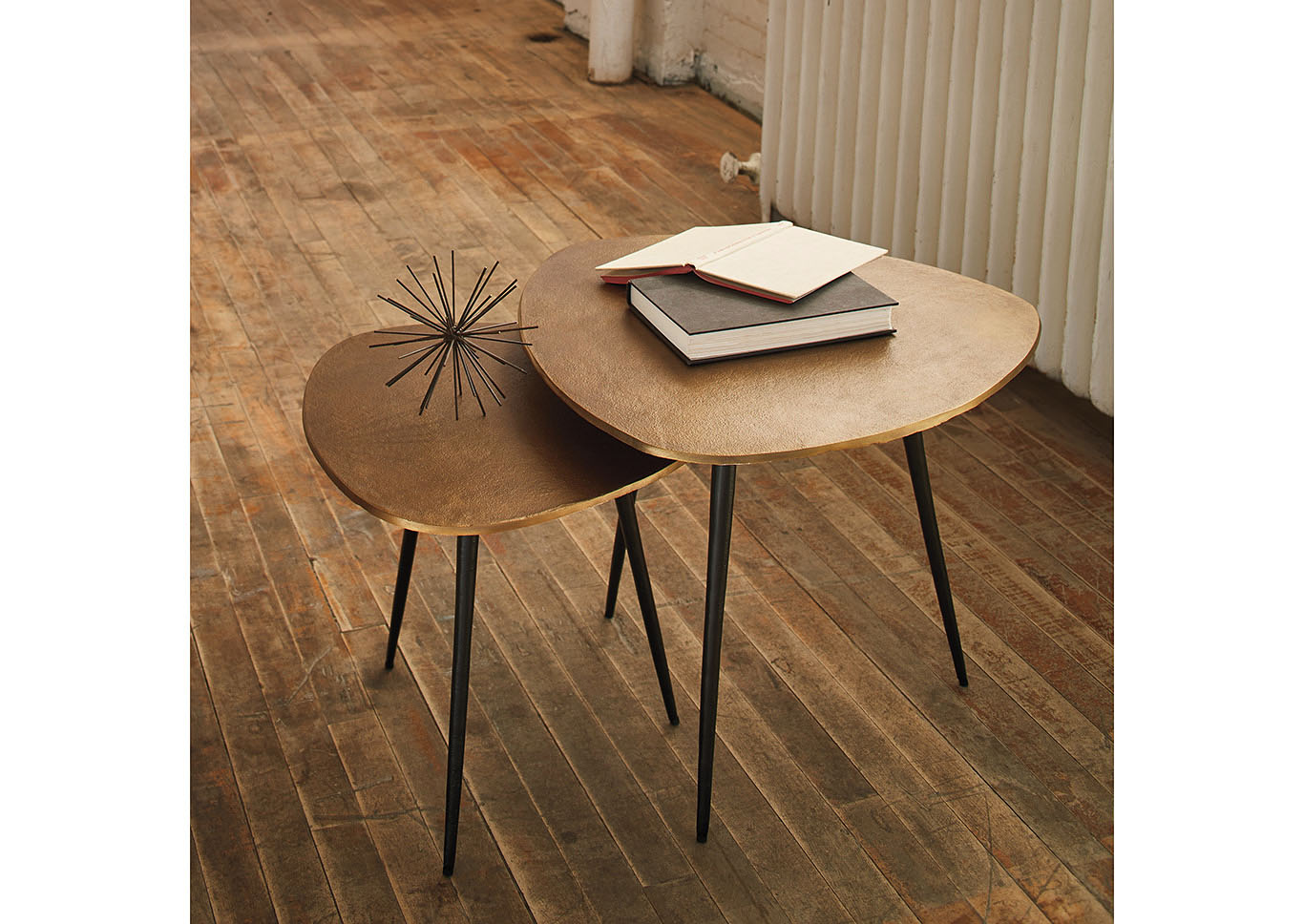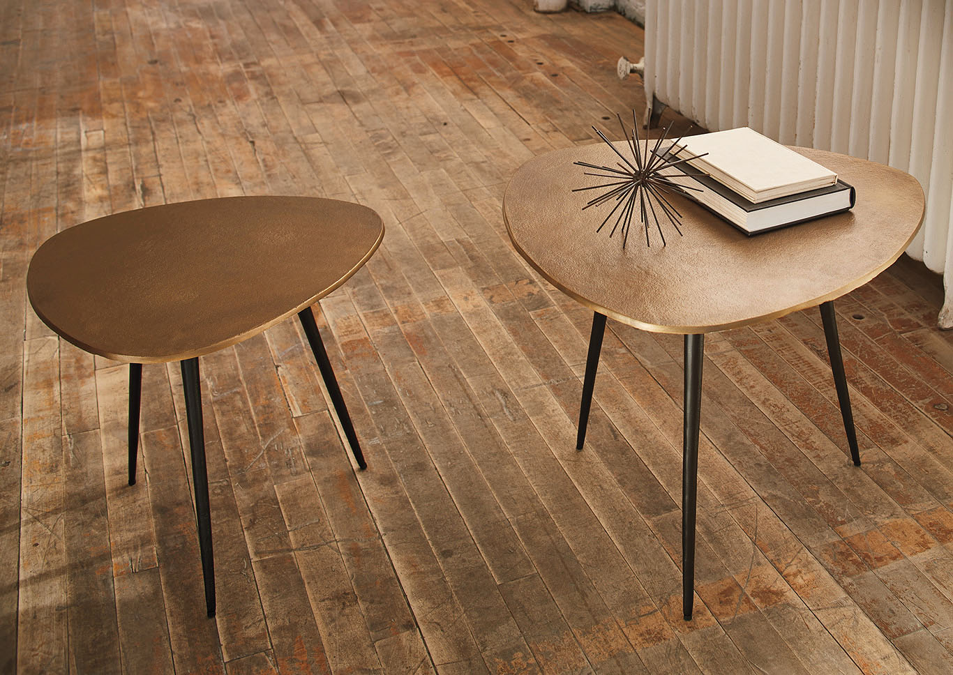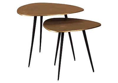 ASHLEY набор SHEMLEIGH (коллекция AMERICAN LIFESTYLE).Стиль: американский Modern.Тип: набор из двух приставных столов в форме медиаторов из литого алюминия.Цвет: чёрный/ золотой.Размеры,мм: высокий(ш.572/г.575/в.464)/низкий(ш.457/г.419/в.451).