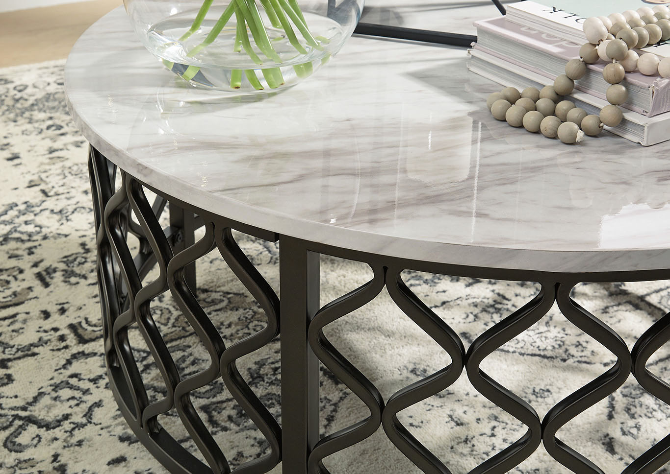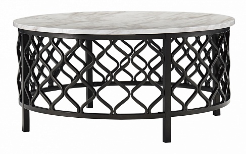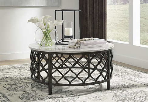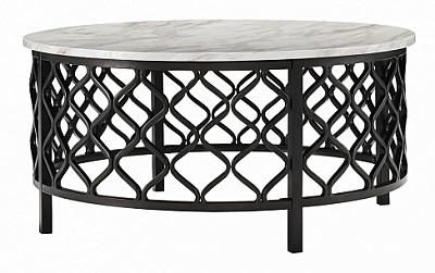 ASHLEY стол TRINSON (коллекция AMERICAN LIFESTYLE).Стиль:американский Modern.Тип: круглый журнальный стол на гнутой чёрной металлической основе.Цвет: серый/чёрный.Отделка: искусственный мрамор с прочным полиуритановым верхним слоем.Размеры,мм:ш.921/г.921/в.457.