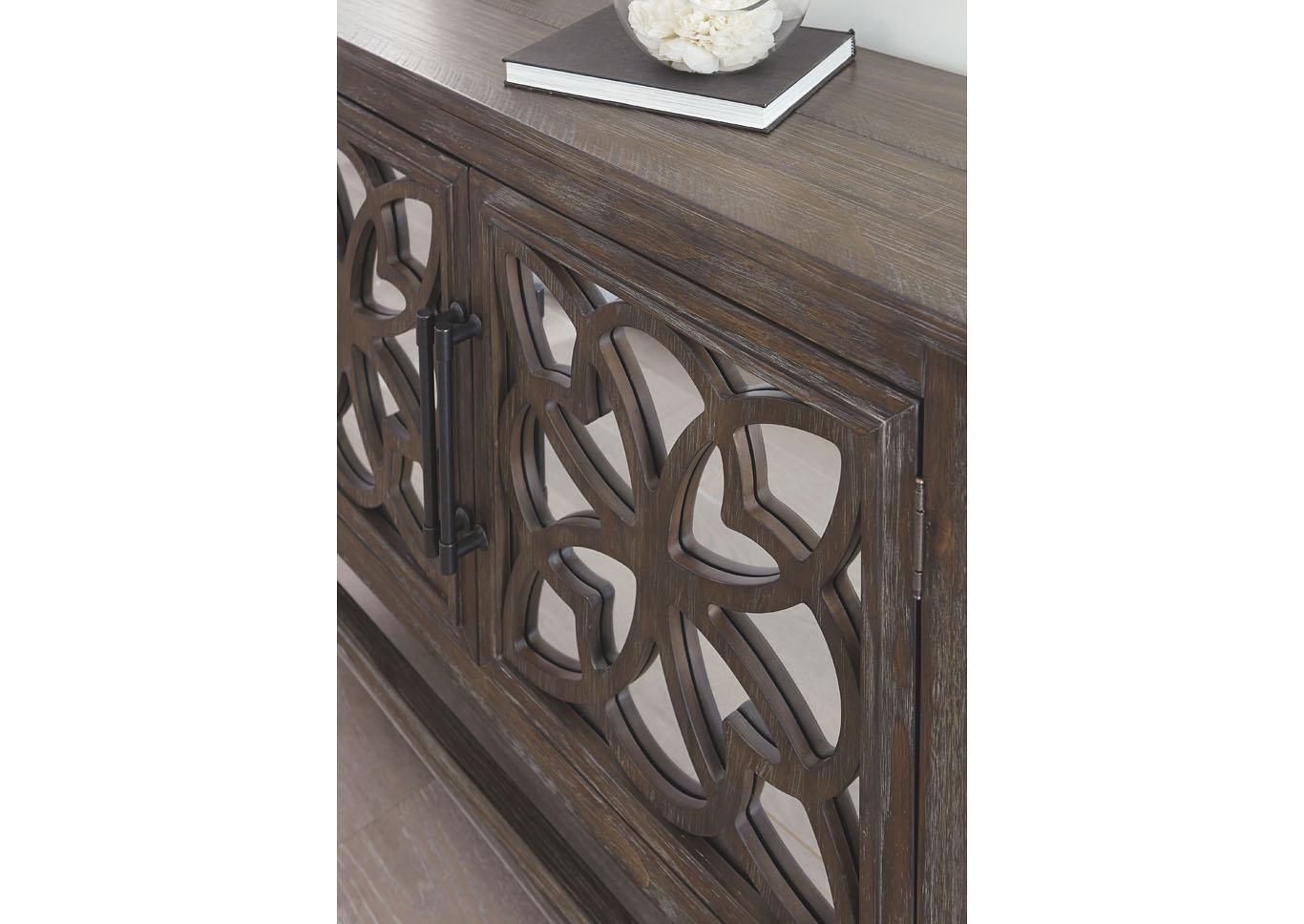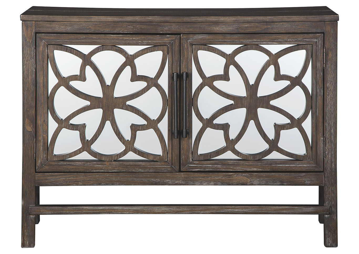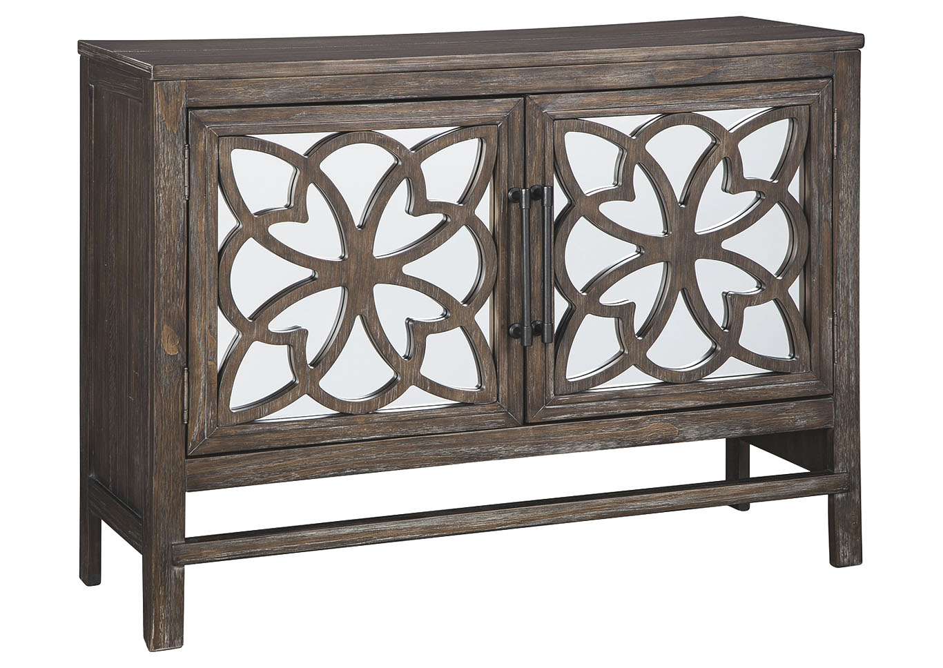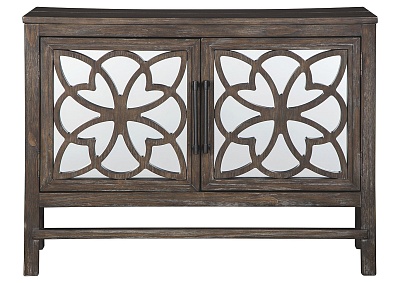 ASHLEY комод ALVATON ( коллекция AMERICAN LIFESTYLE) .Стиль: американский Modern.Тип: акцентный комод для гостиной универсальный с одним шкафом и двумя закрытыми регулируемыми полками.Цвет: коричневый.Отделка: искусственно состаренная;серебристая металлическая фурнитура,резной узор с зеркальными вставками.Размеры,мм:ш.1175/г.406/в.886.