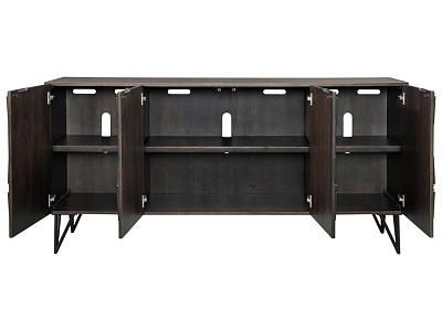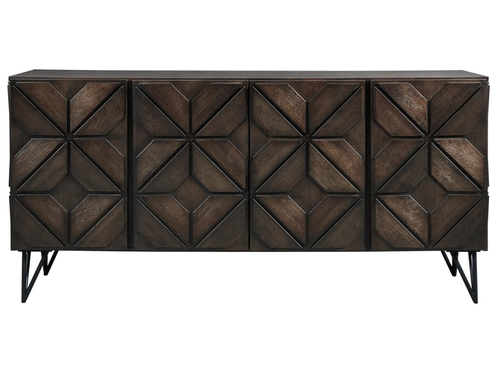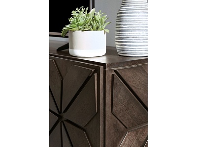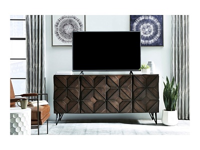 ASHLEY комод CHASINFIELD ( коллекция AMERICAN LIFESTYLE) .Стиль: американский Modern.Тип: акцентный комод( ТВ стенд вмещает телевизор до 75 дюймов) для гостиной,три шкафа,три закрытые регулируемые полки, вырезы для проводов.Цвет: коричневый.Отделка: шпон манго,геометрический дизайн,металлические ножки.Размеры,мм:ш.1848/г.457/в.876.