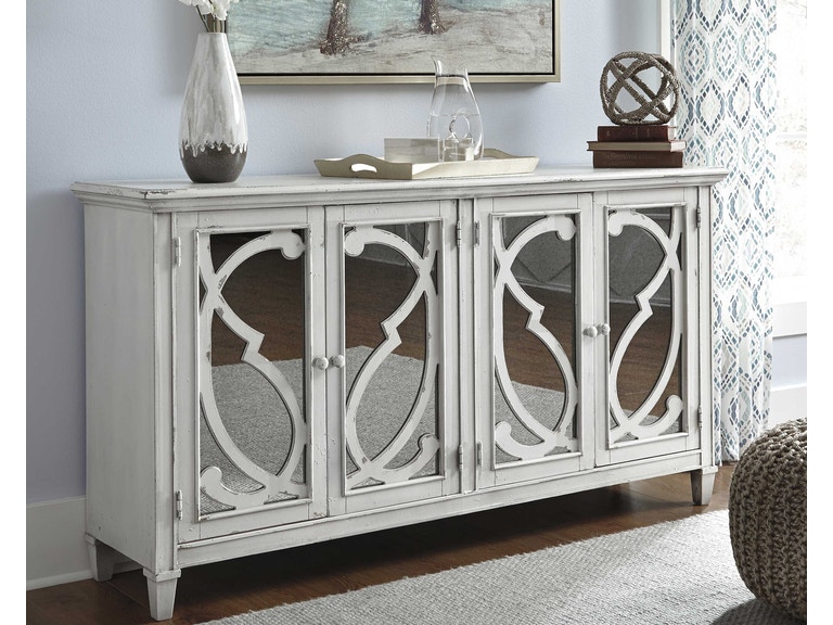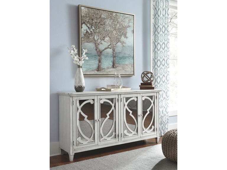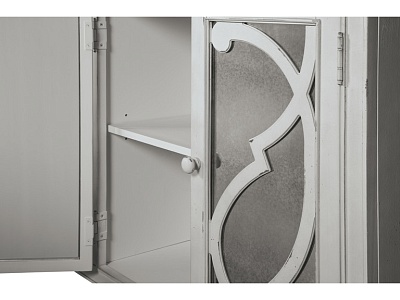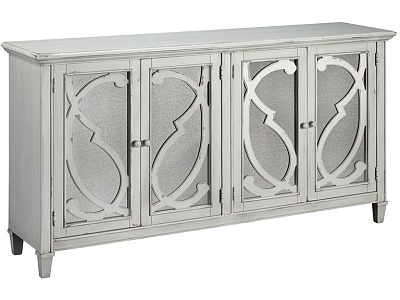 ASHLEY комод MIRIMYN ( коллекция AMERICAN LIFESTYLE) .Стиль: американский Vintage Casual.Тип: акцентный комод для гостиной,два шкафа со стеклянными вставками,две закрытые регулируемые полки.Цвет: серый.Отделка: искусственно состаренная с декоративной прокруткой.Размеры,мм:ш.1718/г.406/в.914.