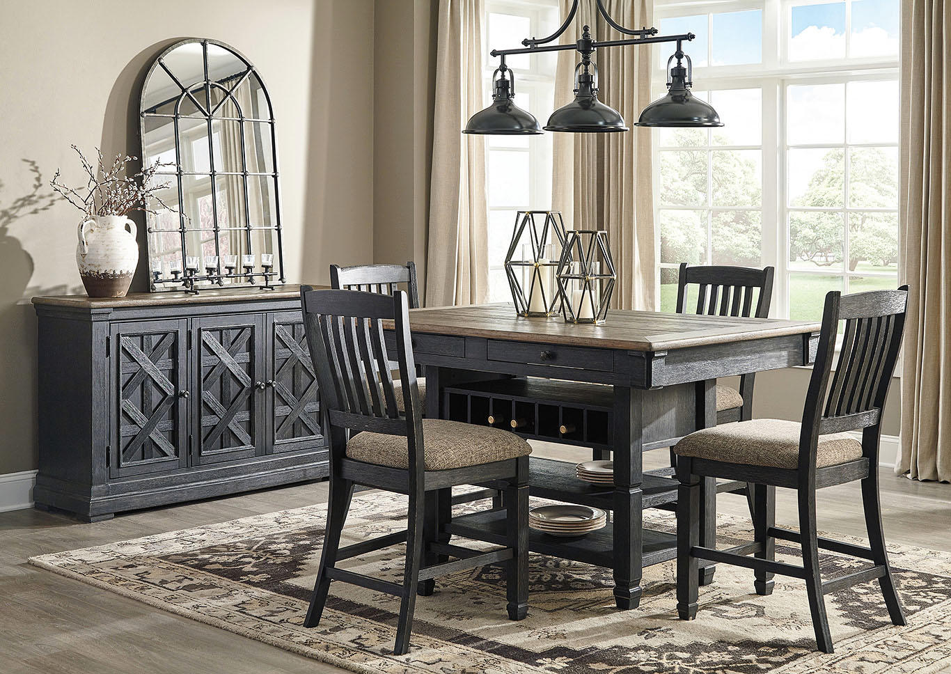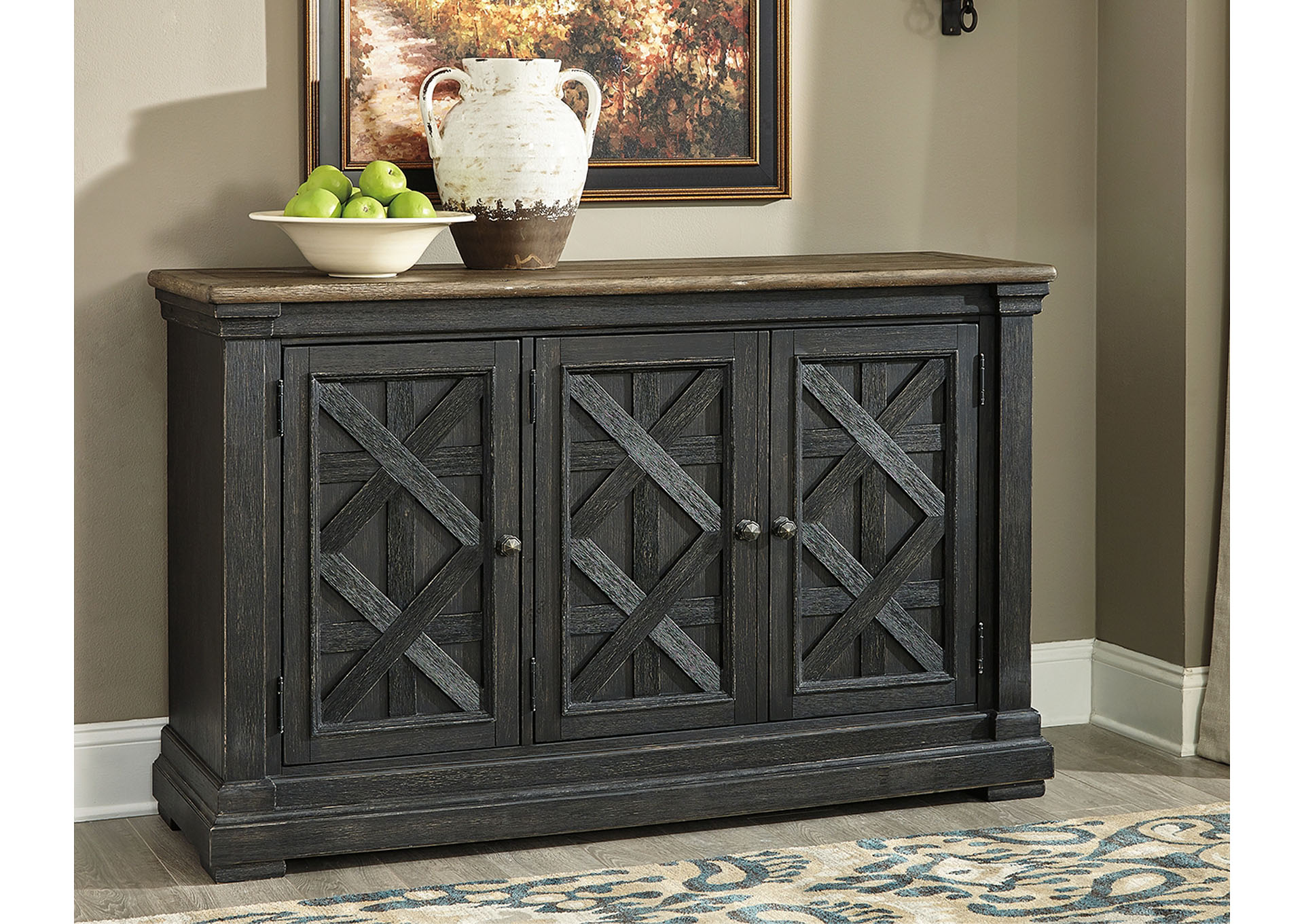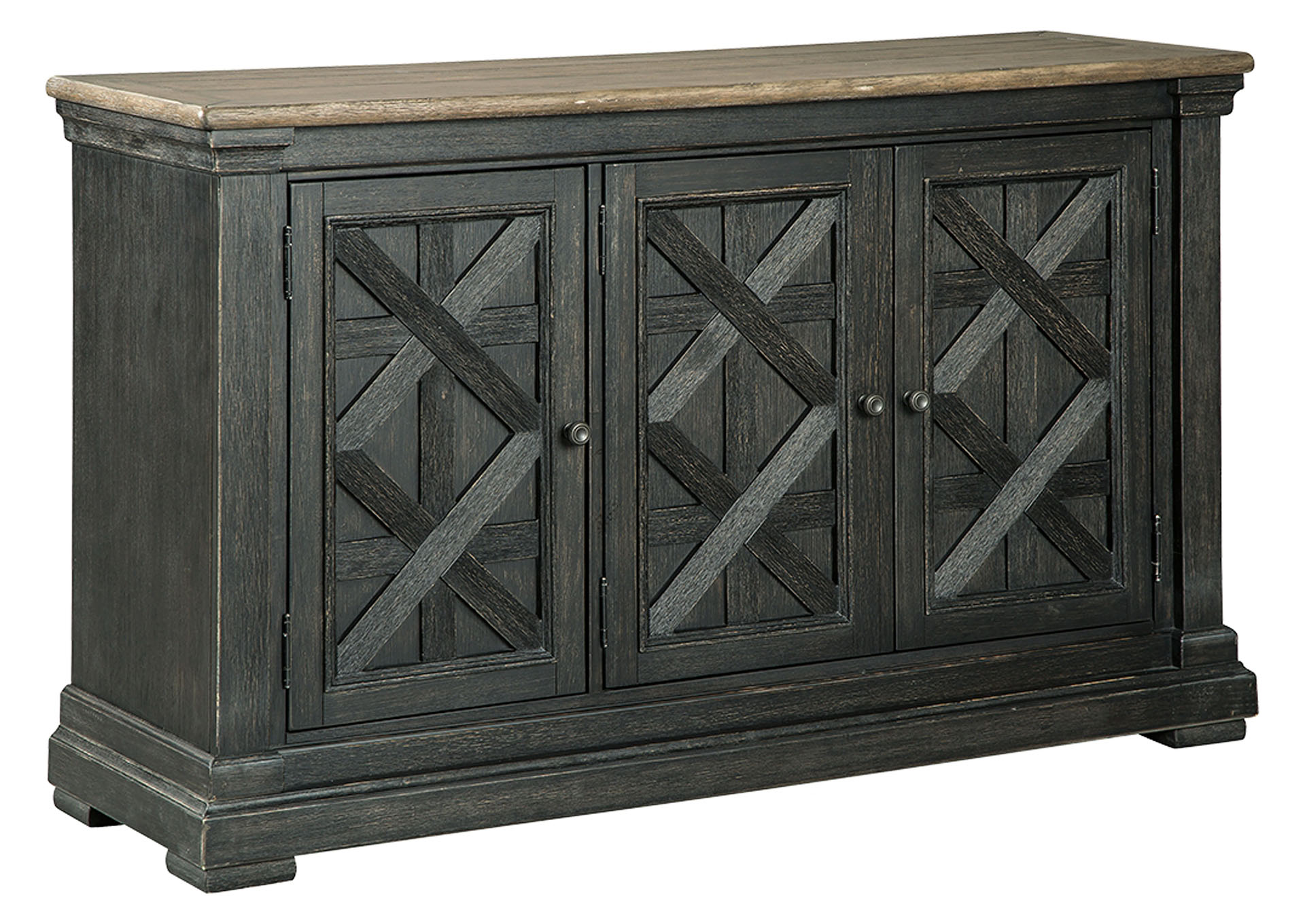 ASHLEY буфет TYLER CREEK (коллекция AMERICAN LIFESTYLE).Стиль: американский Casual.Тип: трёхдверный буфет для столовой, с двумя шкафами,в каждом по две регулируемые полки.Цвет: чёрный/серо-коричневый.Отделка: двухцветная текстурная;искусственно состаренный шпон дуба;дощатая столешница;решётчатые двери;металлическая бронзовая фурнитура.Размеры,мм:ш.1473/г.461/в.920.