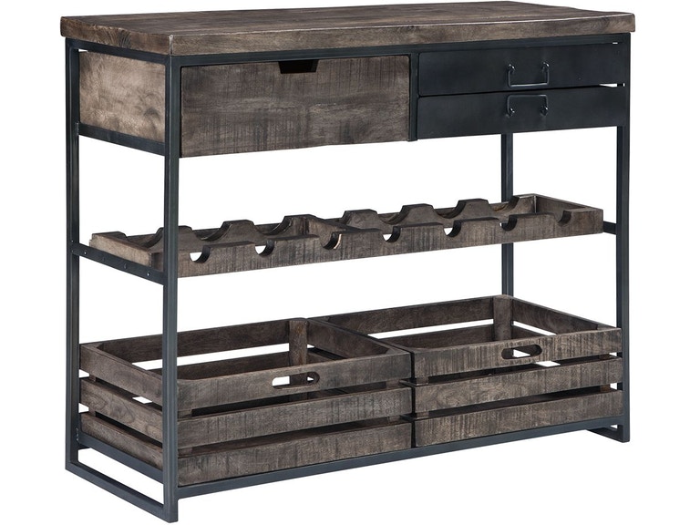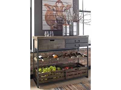 ASHLEY буфет PONDER RIDGE ( коллекция AMERICAN LIFESTYLE) .Стиль: американский Vintage Casual.Тип: буфет для столовой акцентный, на металлическом каркасе с тремя выдвижными ящиками,двумя съёмными контейнерами и винной стойкой на семь бутылок .Цвет: чёрный/коричневый.Отделка: двухцветная искусственно состаренная.Размеры,мм:ш.1105/г.422/в.927.