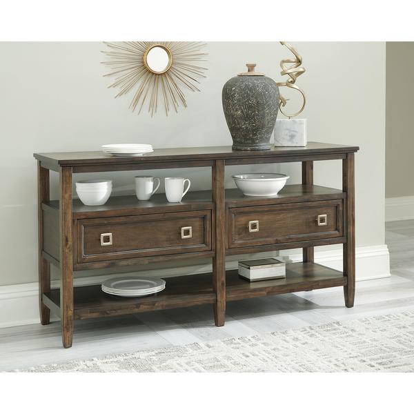 ASHLEY буфет RAEHURST (коллекция AMERICAN LIFESTYLE).Стиль: американский Modern.Тип: буфет сервировочный для столовой,с двумя выдвижными ящиками,витринным пространством и одной фиксированной открытой полкой.Цвет: тёмно- коричневый.Отделка: шпон манго,металлическая фурнитура квадратной формы с закруглёнными углами.Размеры,мм:ш.1473/г.432/в.775.