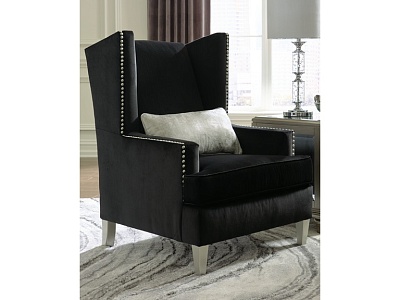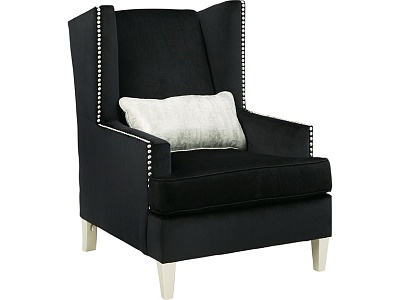 ASHLEY кресло HARRIOTTE ( коллекция AMERICAN LIFESTYLE).Стиль: американский Traditional.Тип: кресло акцентное для гостиной в дизайне Hollywood Regency,на открытых точёных ножках серебрянного цвета, с одной декоративной подушкой в комплекте.Цвет: чёрный.Обивка: сложнофактурная ткань,100% полиэстер,категория высшая,одобрена по высоким американским стандартам качества AHFA(износостойкость,долговечность).Отделка: тафтинг пуговицами; декоративные металлические мебельные гвозди.Размеры.мм:ш.737/г.788/в.1143.