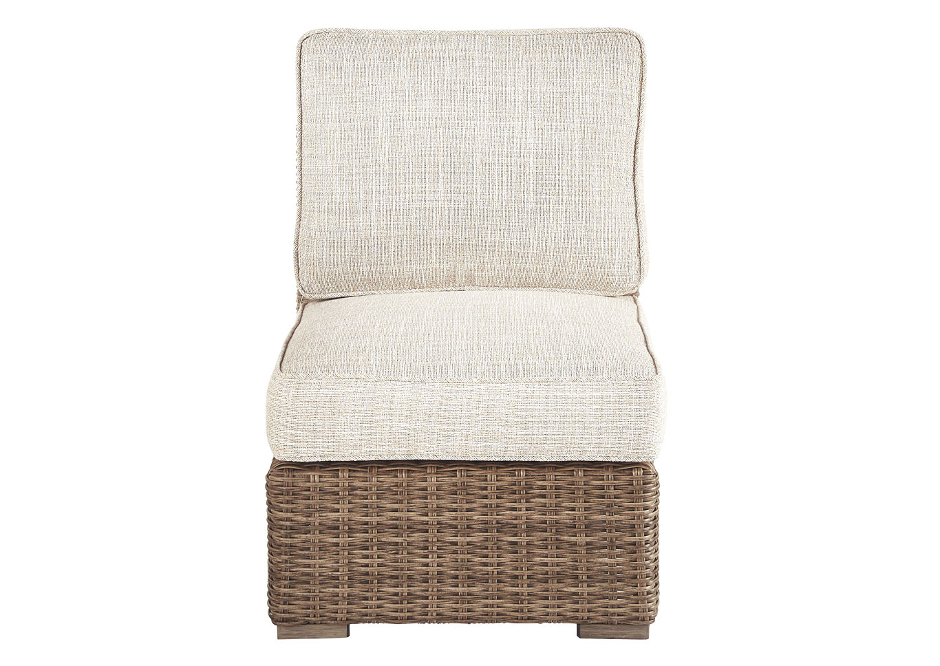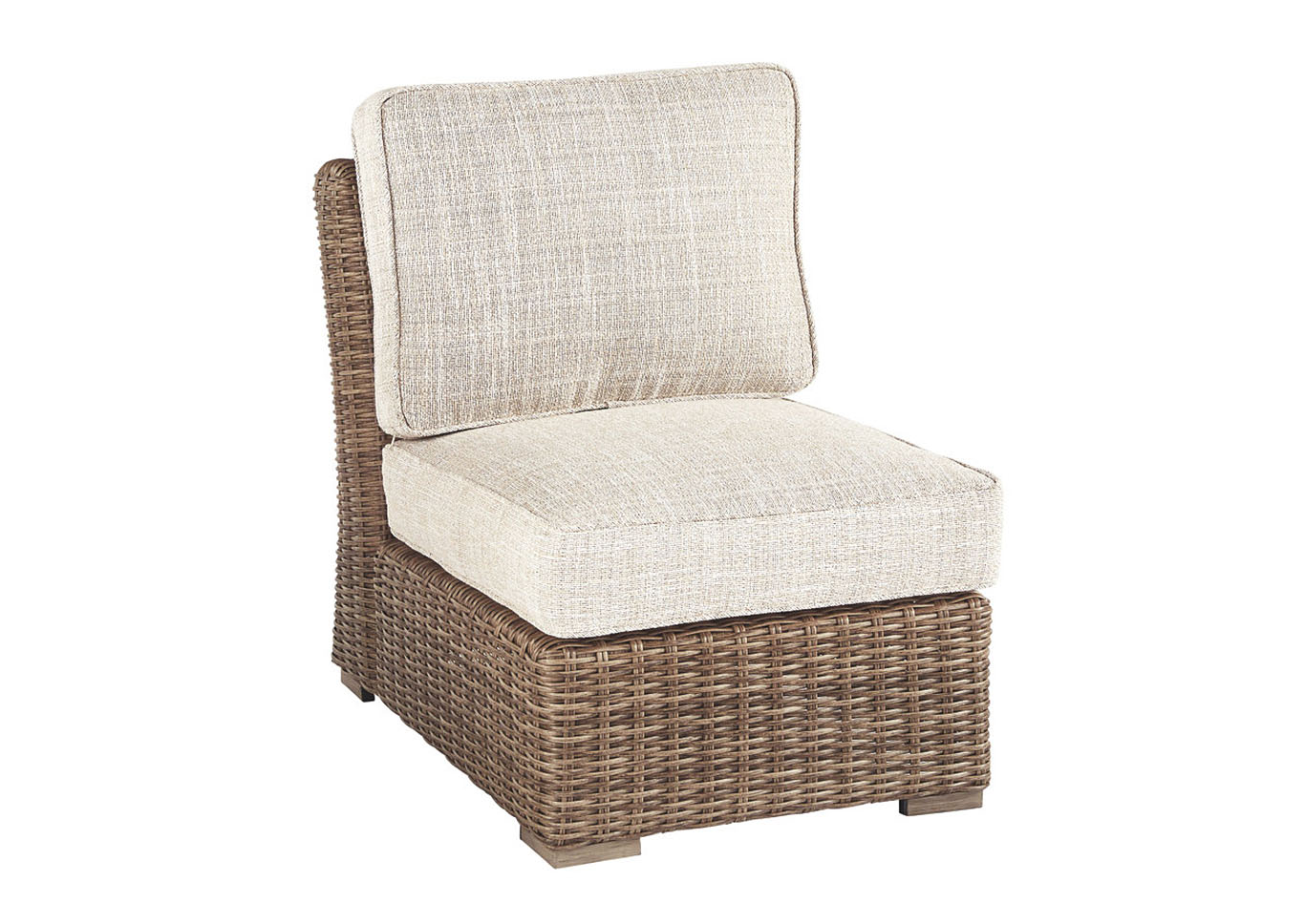 ASHLEY кресло секционное для улицы BEACHCROFT ( коллекция AMERICAN LIFESTYLE). .Стиль: американский Vintage Casual .Тип: кресло секционное без подлокотников для улицы с каркасом из алюминия,совместимо с другими предметами этой серии .Цвет: бежевый .Обивка: высокоэффективная неприхотливая в уходе ткань от Nuvella,100% полиэстер,категория высшая,одобрена по высоким американским стандартам качества AHFA(износостойкость,долговечность),всепогодный пенный наполнитель подушек.Отделка: прутья из эпоксидной смолы . Размеры,мм:ш.616/г.965/в.927.