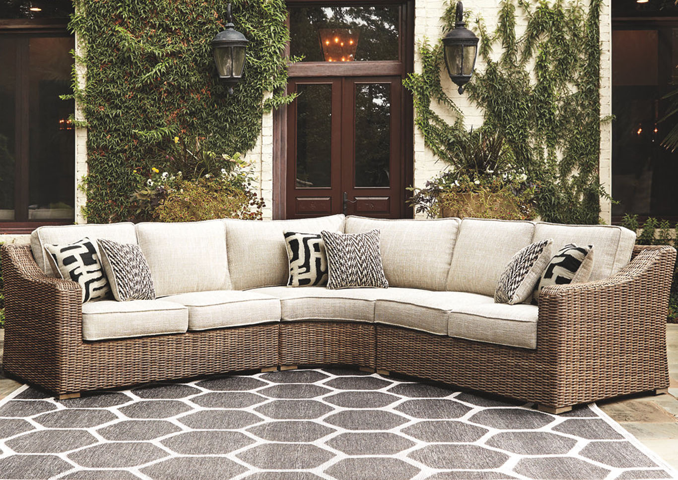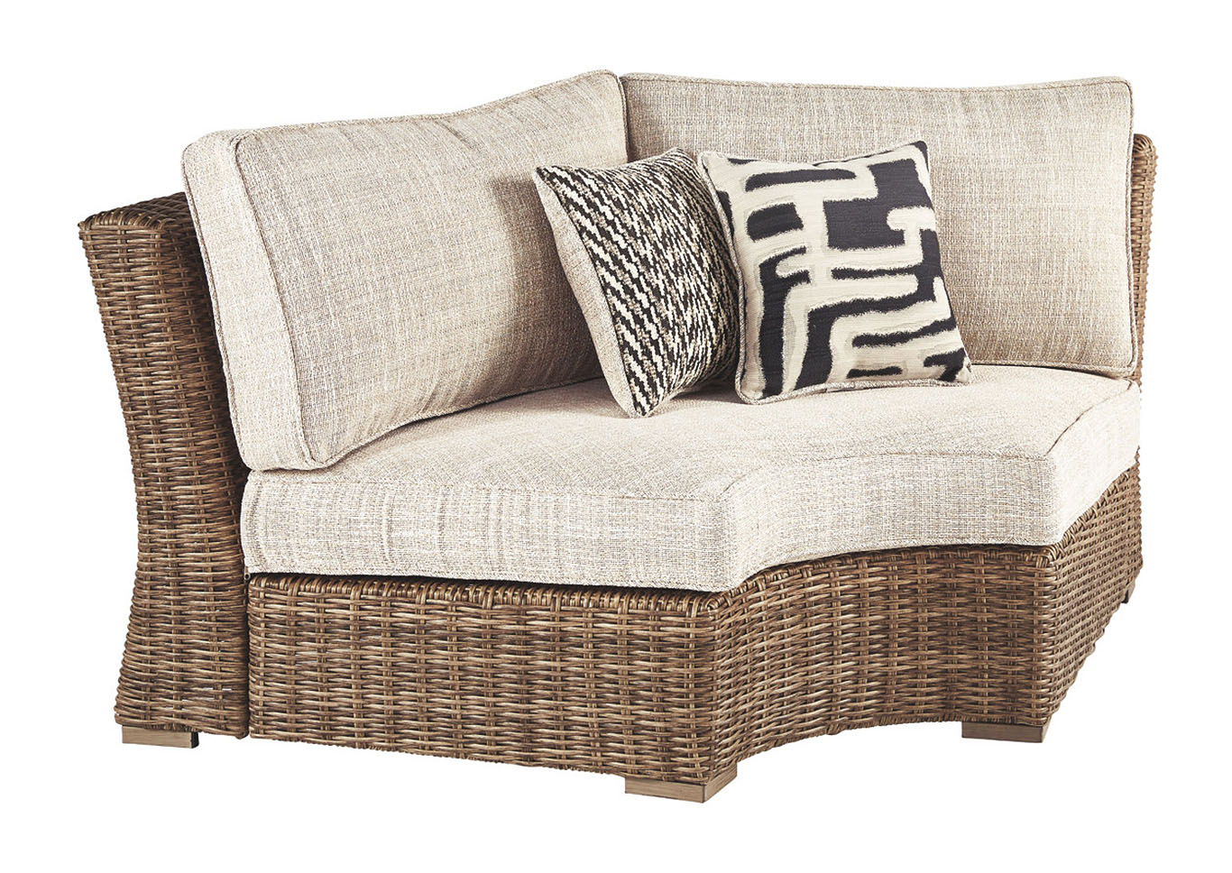 ASHLEY кресло секционное для улицы BEACHCROFT ( коллекция AMERICAN LIFESTYLE). .Стиль: американский Vintage Casual .Тип: кресло секционное для улицы с закруглённым углом каркасом из алюминия и двумя декоративными подушками в комплекте,совместимо с другими предметами этой серии .Цвет: бежевый .Обивка: высокоэффективная неприхотливая в уходе ткань от Nuvella,100% полиэстер,категория высшая,одобрена по высоким американским стандартам качества AHFA(износостойкость,долговечность),всепогодный пенный наполнитель подушек.Отделка: прутья из эпоксидной смолы . Размеры,мм:ш.1829/г.1041/в.965.