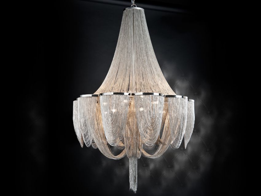 SCHULLER люстра MINERVA.Стиль: Classical.Тип:двенадцатиламповая, металлическая, каскадная подвесная люстра оригинального дизайна.Цвет:серебро.Отделка:тонкие декоративные металлические цепи.Размеры,мм:диам.680/в.1100/в.с подвесом1250-2000.