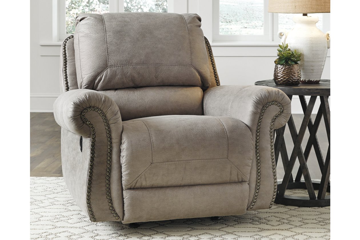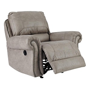 ASHLEY кресло OLSBERG( коллекция AMERICAN LIFESTYLE) .Стиль: американский Vintage Casual.Тип: кресло-качалка реклайнер с механическим приводом.Цвет:серый.Обивка: 3% экокожа,97% полиэстер(ткань),категория высшая,одобрена по высоким американским стандартам качества AHFA(износостойкость,долговечность).Отделка: декоративные металлические мебельные гвозди.Размеры,мм:ш.1092/г.1016/в.1016.