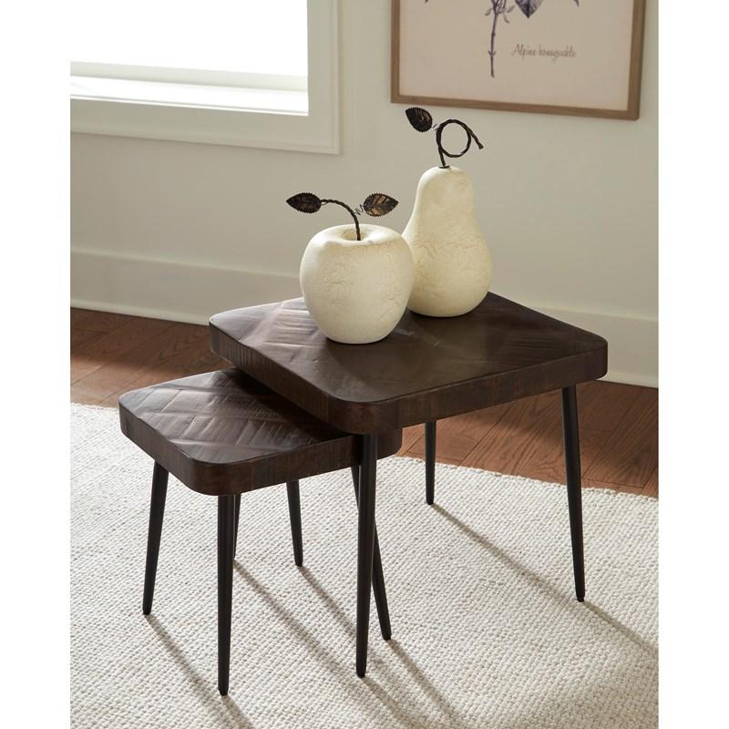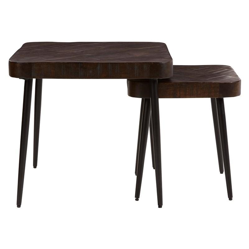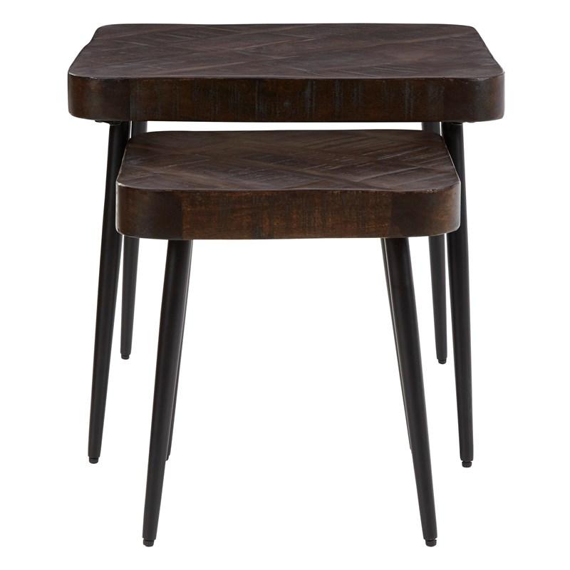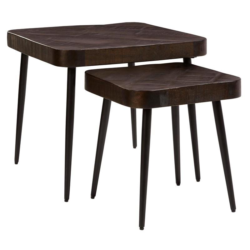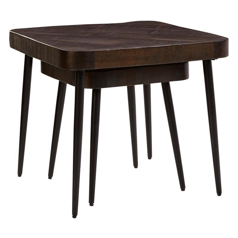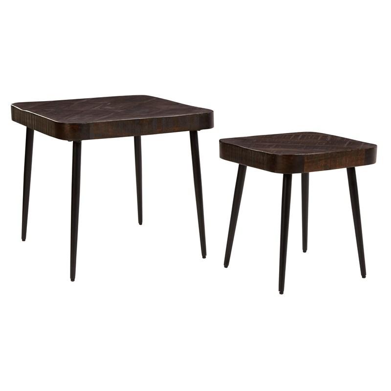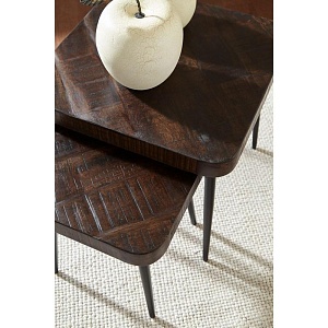ASHLEY набор RAVENWOOD (коллекция AMERICAN LIFESTYLE).Стиль: американский Modern.Тип: набор из двух квадратных приставных столов на чёрных металлических ножках.Цвет: коричневый/ чёрный.Отделка: искусственно состаренная. Размеры,мм: высокий(ш.508/г.508/в.470)/низкий(ш.360/г.360/в.387).