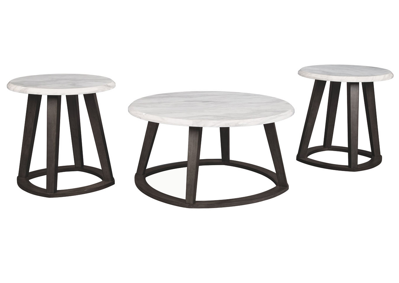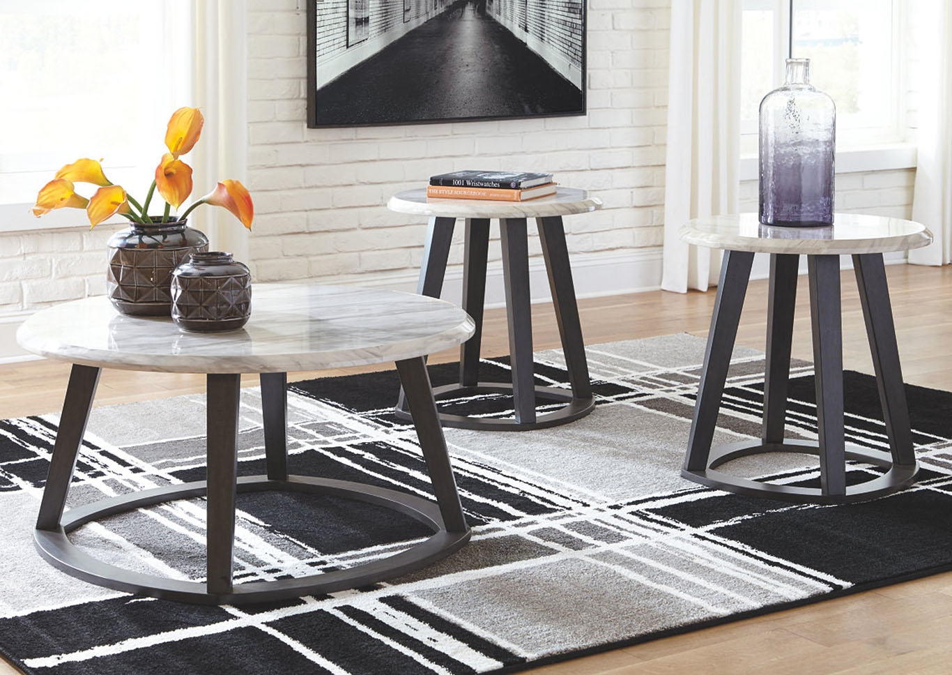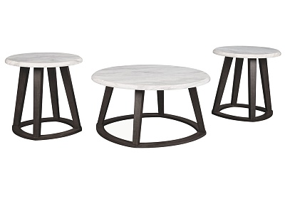 ASHLEY набор LUVONI (коллекция AMERICAN LIFESTYLE).Стиль: американский Modern.Тип: набор круглых столов: журнальный + два приставных, на чёрном скульптурном основании.Цвет: серый/белый.Отделка: искусственный мрамор Carrara. Размеры,мм: журнальный(ш.965/г.965/в.483);приставной(ш.610/г.610/в.610).