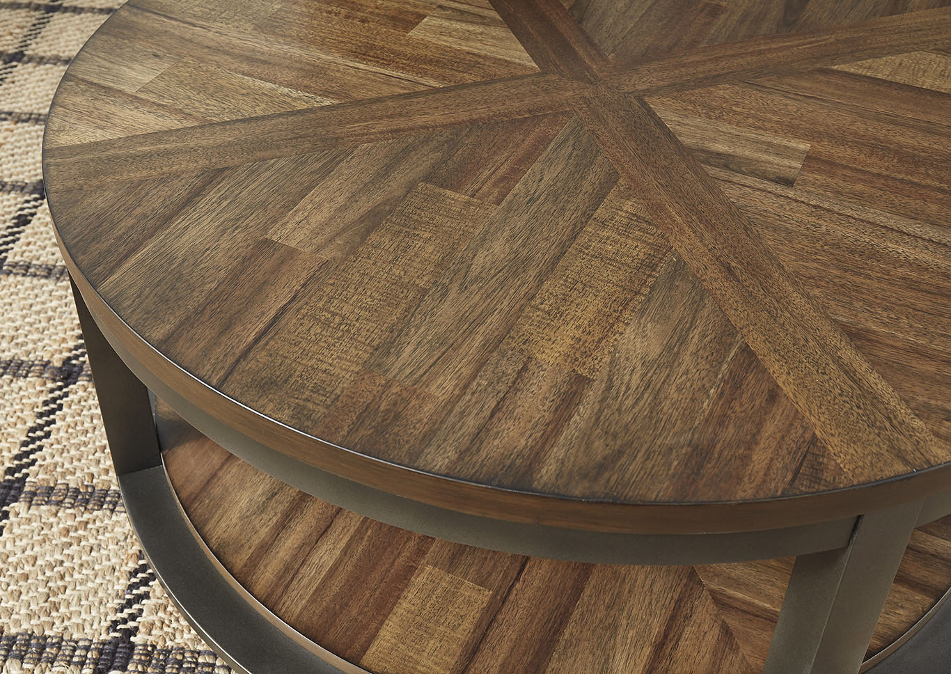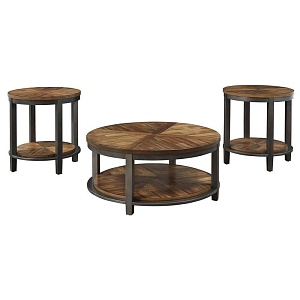 ASHLEY набор ROYBECK ( коллекция AMERICAN LIFESTYLE) .Стиль: американский Vintage Casual.Тип: набор круглых столов; журнальный+два приставных,каждый с фиксированной полкой на металлической бронзовой раме .Цвет: коричневый.Отделка: шпон акации с узором"бабочка".Размеры,мм: журнальный(ш.965/г.965/в.457.);приставной(ш.584/г.584/в.610.)