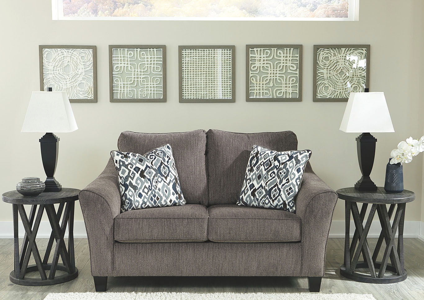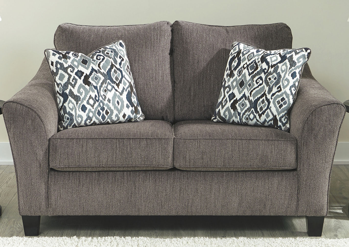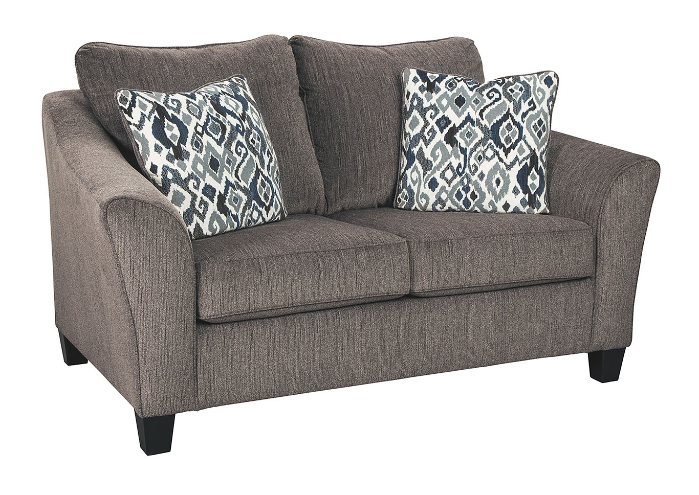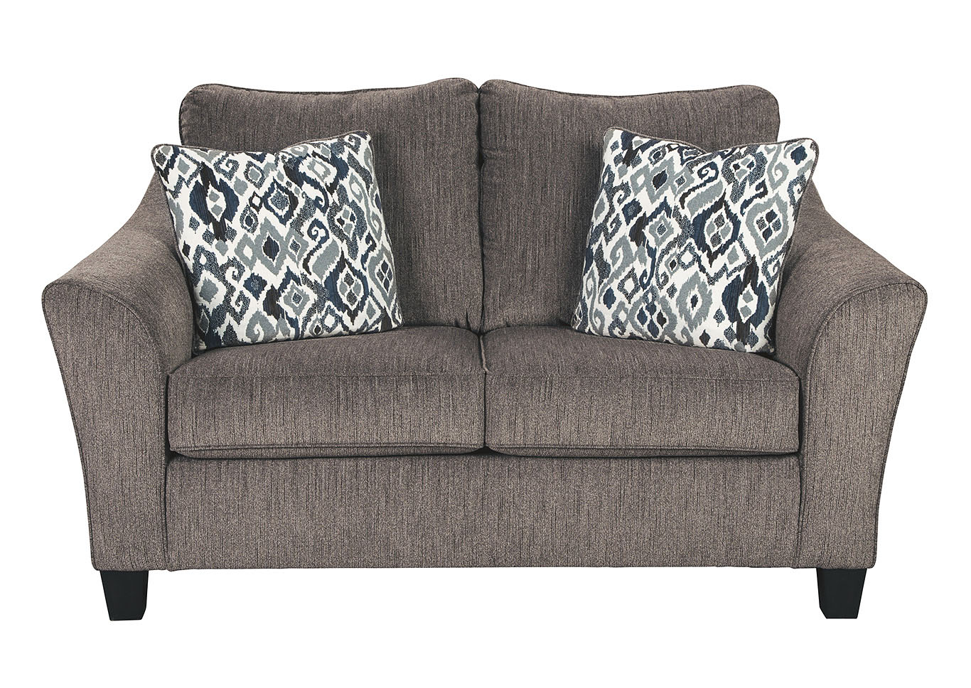 ASHLEY диван 2-М NEMOLI ( коллекция AMERICAN LIFESTYLE).Стиль: американский Modern .Тип: диван двухместный нераскладной с открытыми ножками и двумя декоративными подушками в комплекте.Цвет: серый .Обивка: сложнофактурная ткань 100% полиэстер,категория высшая,одобрена по высоким американским стандартам качества AHFA( износостойкость,долговечность).Размеры,мм: ш.1727/г.1016/1041.