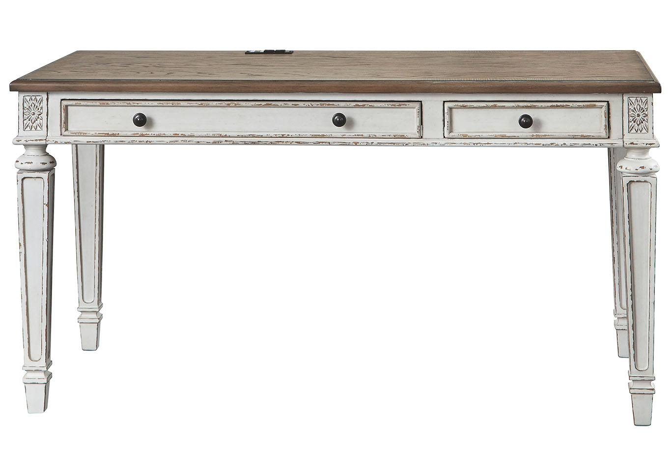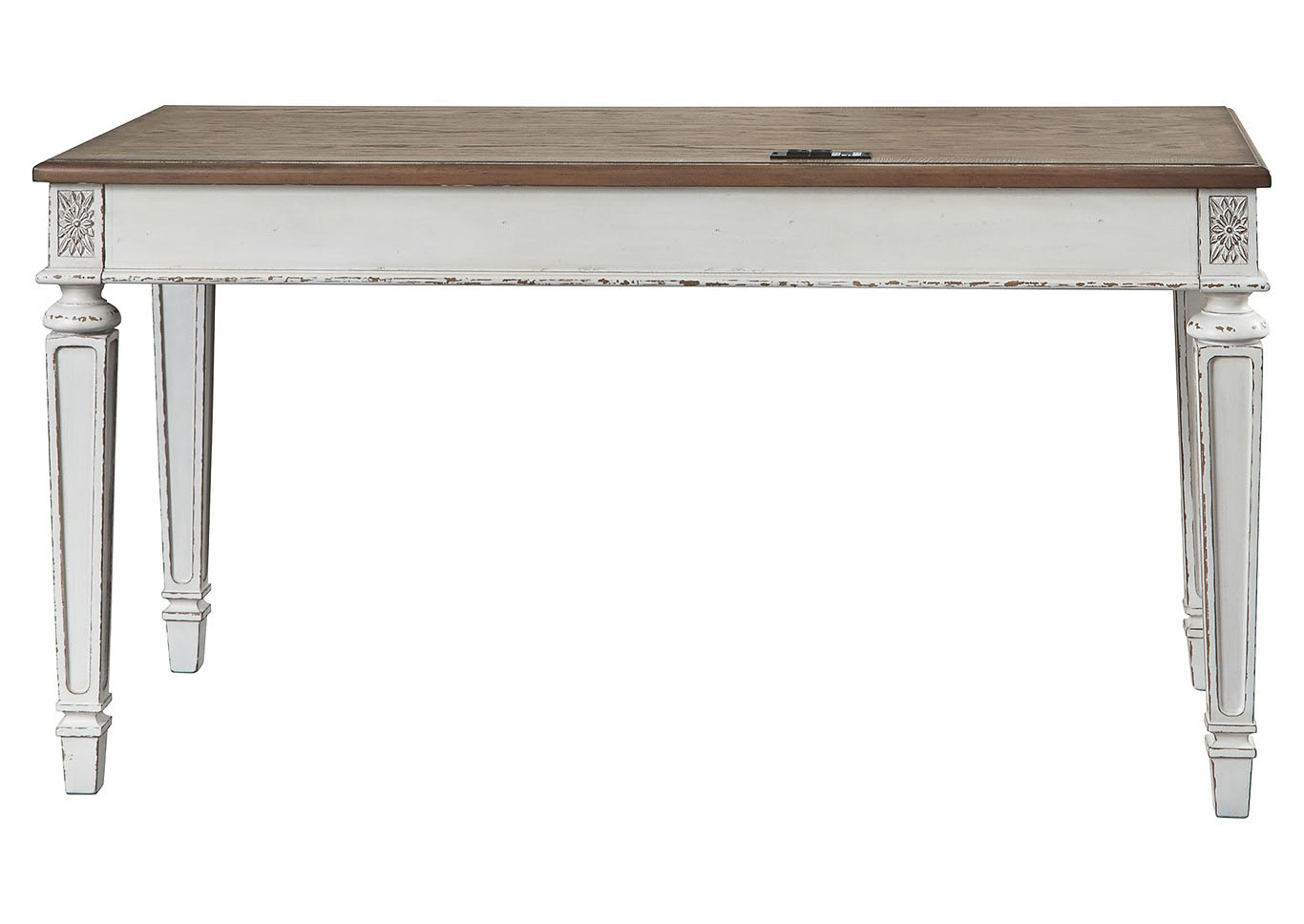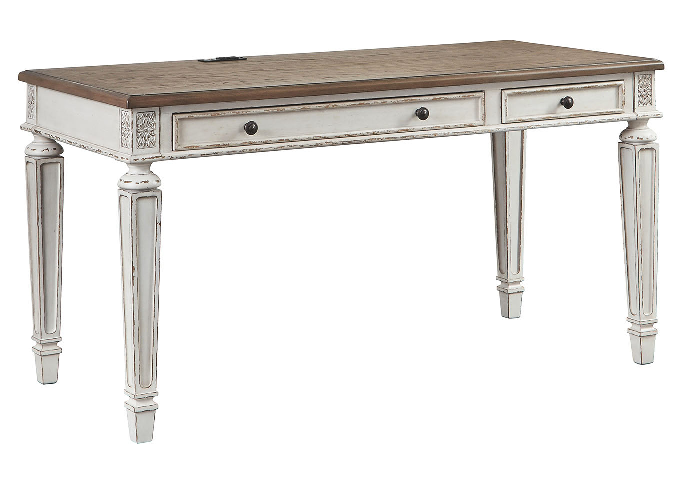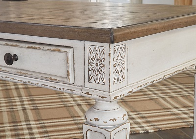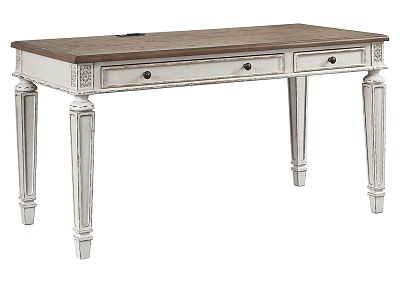 ASHLEY стол REALYN(коллекция AMERICAN LIFESTYLE).Стиль: американский Vintage Casual.Тип: кабинетный письменный/компьютерный стол с двумя ящиками, скрытой выдвижной полкой под клавиатуру и встроенными USB-портами.Цвет: белый,коричневый.Отделка: двухцветная искусственно состаренная,столешница шпон дуба,бронзовая металлическая фурнитура,акценты из литой смолы.Размеры,мм:ш.1524/г.711/в.787.