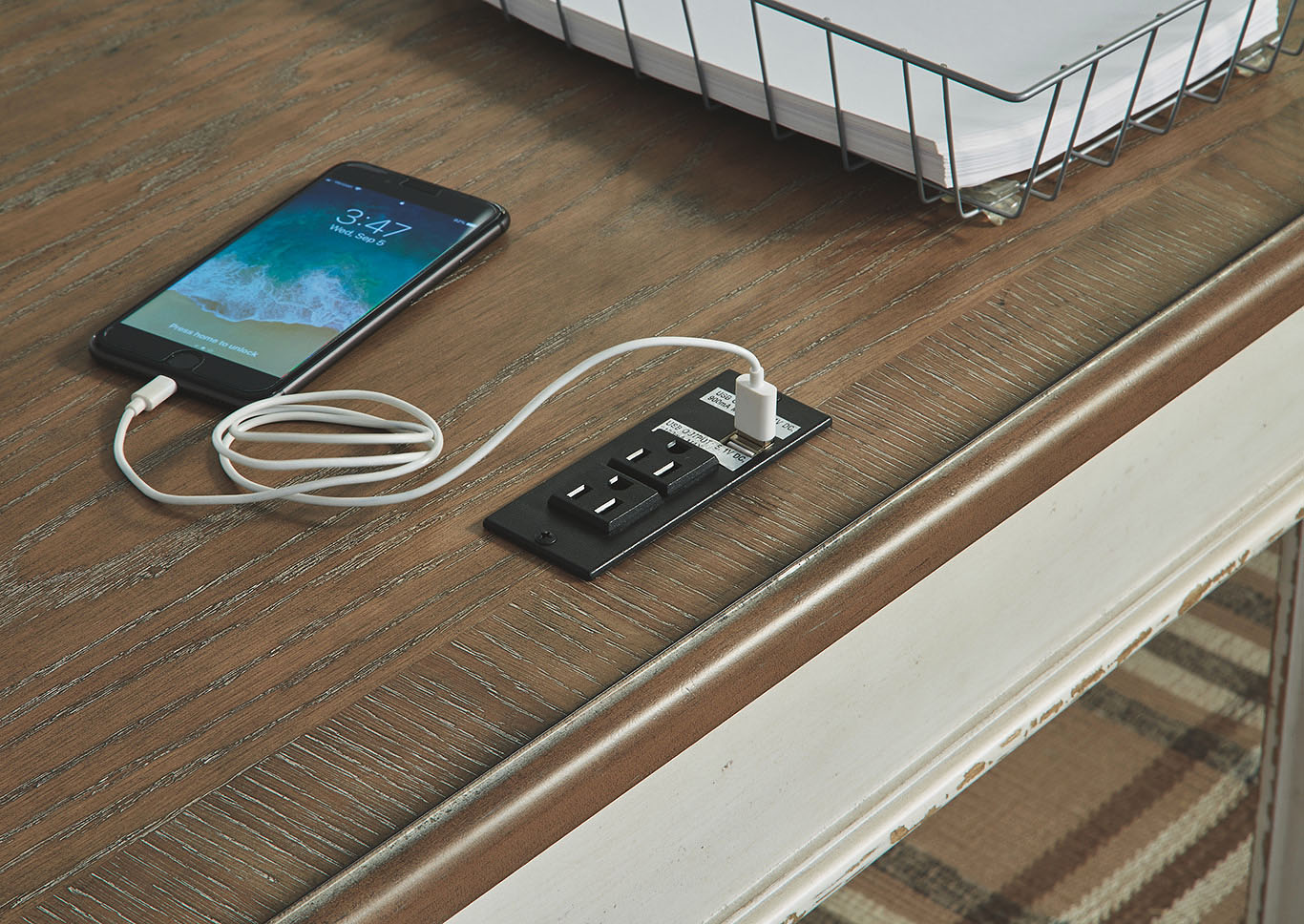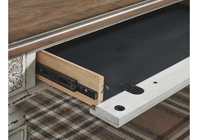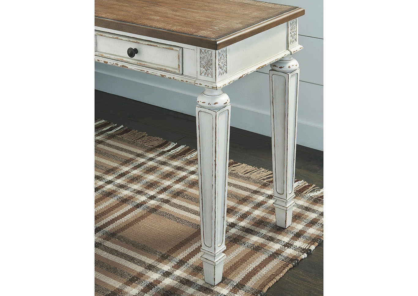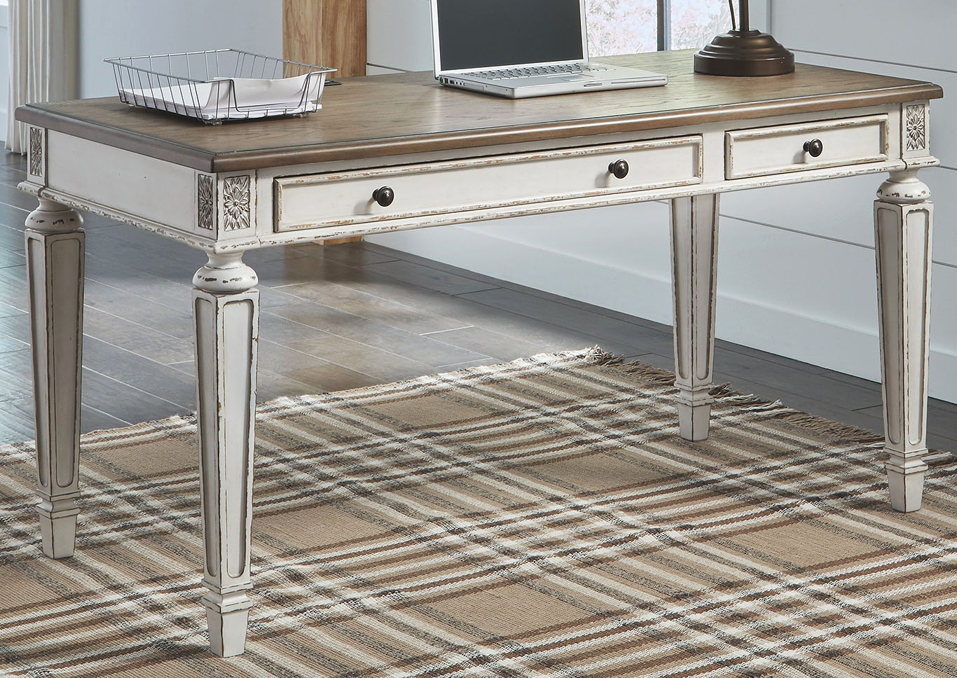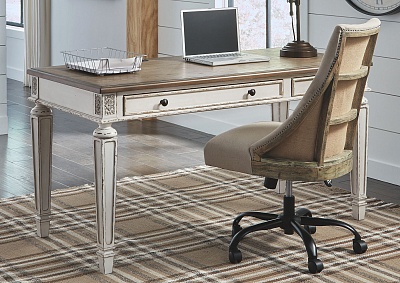 ASHLEY стол REALYN(коллекция AMERICAN LIFESTYLE).Стиль: американский Vintage Casual.Тип: кабинетный письменный/компьютерный стол с двумя ящиками, скрытой выдвижной полкой под клавиатуру и встроенными USB-портами.Цвет: белый,коричневый.Отделка: двухцветная искусственно состаренная,столешница шпон дуба,бронзовая металлическая фурнитура,акценты из литой смолы.Размеры,мм:ш.1524/г.711/в.787.