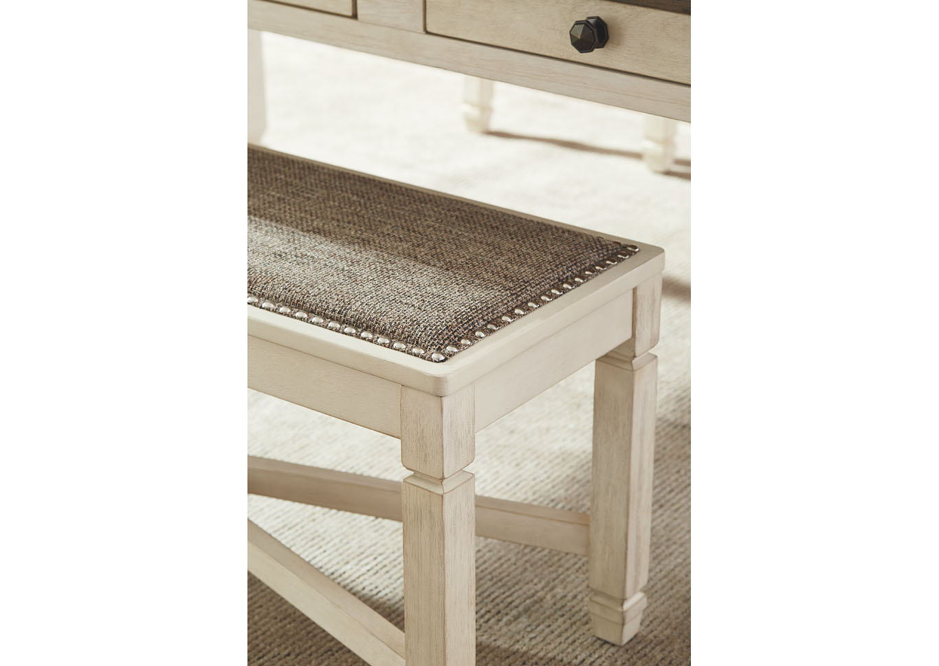 ASHLEY скамья BOLANBURG(коллекция AMERICAN LIFESTYLE).Стиль:американский Vintage Casual( Mane+Mason).Тип:скамья с мягким сиденьем.Цвет:белый,коричневый.Обивка:сложнофактурная ткань 100% полиэстер,категория высшая,одобрена по высоким американским стандартам качества AHFA(износостойкость,долговечность).Отделка:двухцветная искусственно состаренная,декоративные металлические мебельные гвозди.Размеры,мм:ш.1273/г.384/в.495.