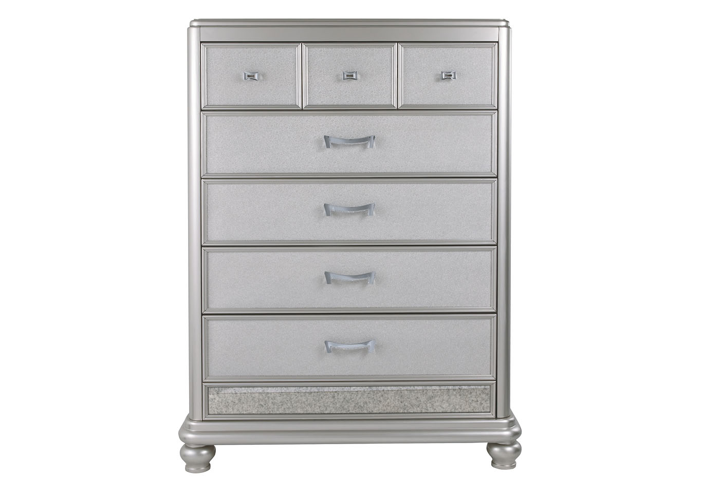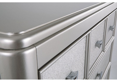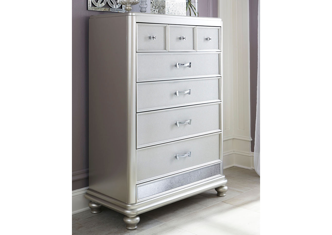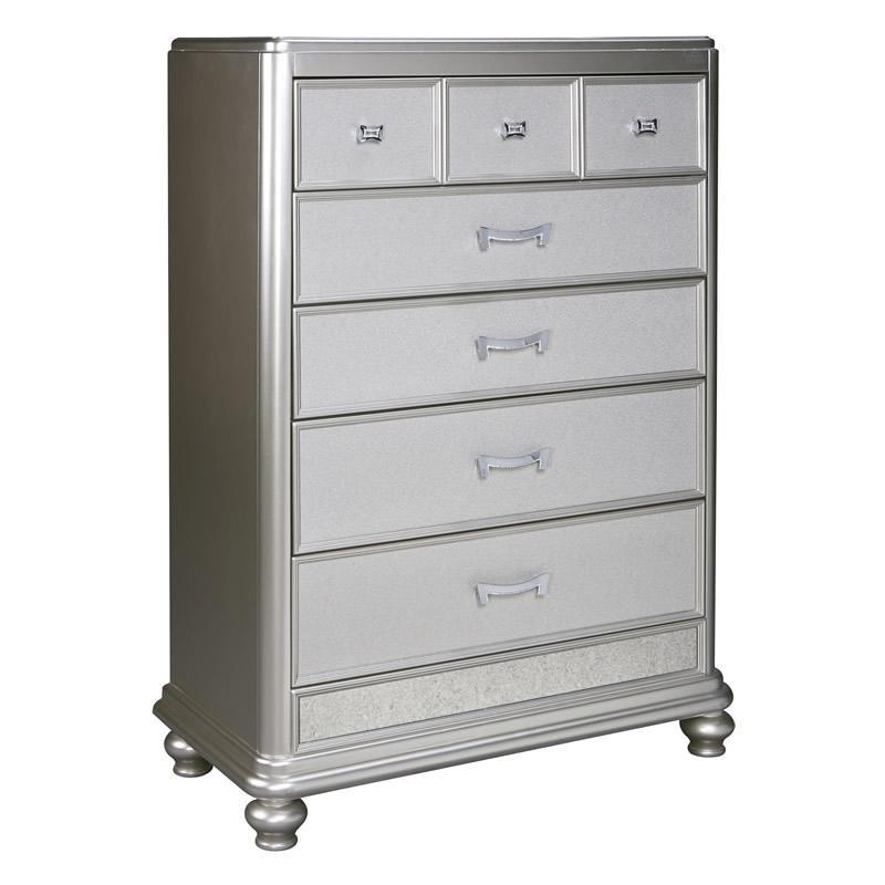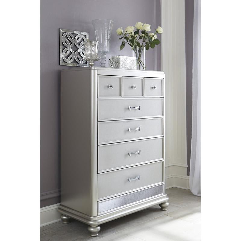ASHLEY комод CORALAYNE(коллекция AMERICAN LIFESTYLE).Стиль: американский Traditional.Тип: комод для спальни высокий,пять ящиков,один верхний из них, обит фетром.Цвет:серебро.Отделка:металлический блеск,зеркальная окантовка,шагреневая текстура фасадов ящиков,хромированная фурнитура украшенная искусственным хрусталем.Размеры,мм:ш.990/г.480/в.1410.
