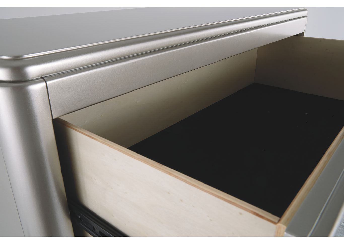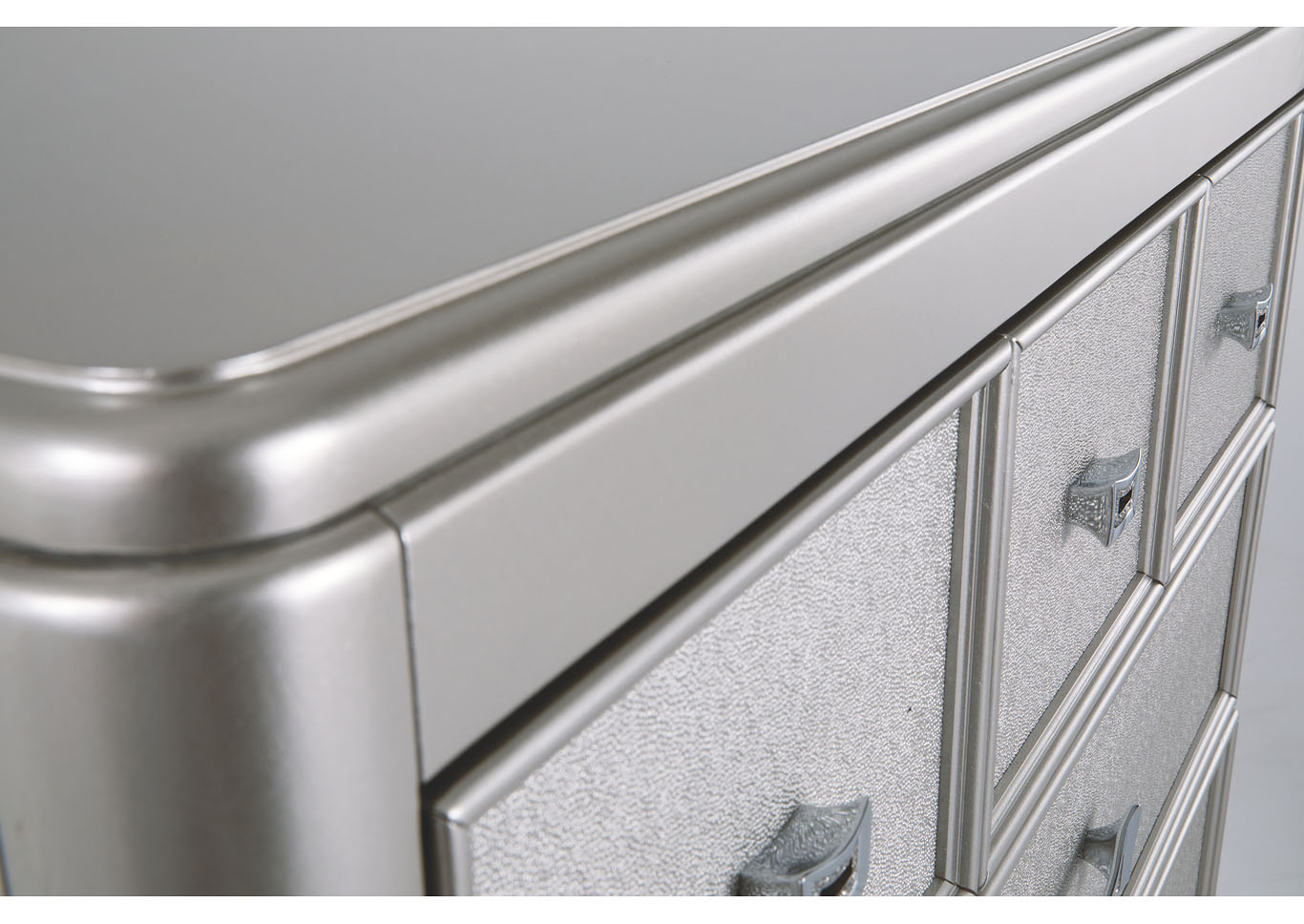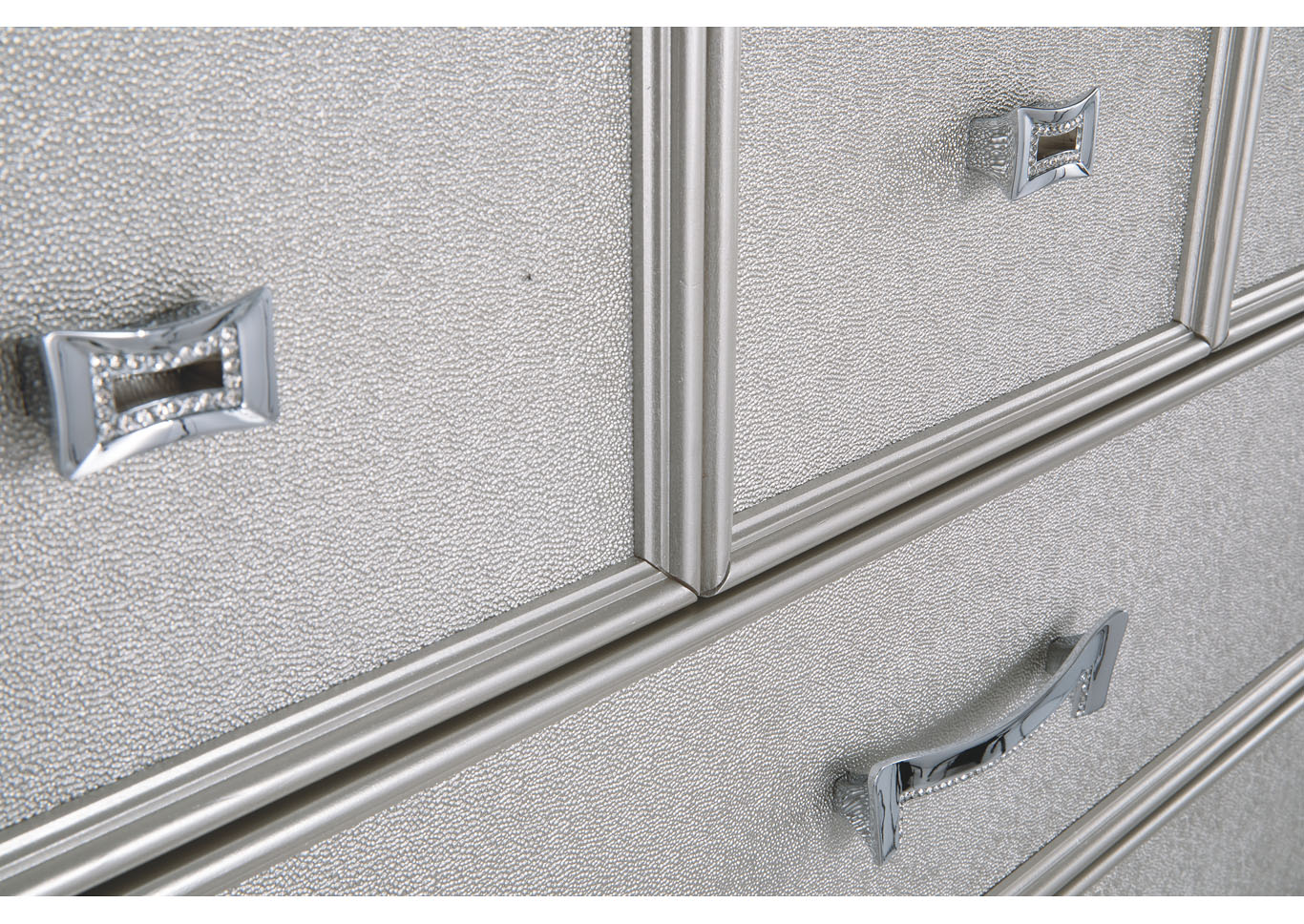 ASHLEY комод CORALAYNE(коллекция AMERICAN LIFESTYLE).Стиль: американский Traditional.Тип: комод для спальни высокий,пять ящиков,один верхний из них, обит фетром.Цвет:серебро.Отделка:металлический блеск,зеркальная окантовка,шагреневая текстура фасадов ящиков,хромированная фурнитура украшенная искусственным хрусталем.Размеры,мм:ш.990/г.480/в.1410.