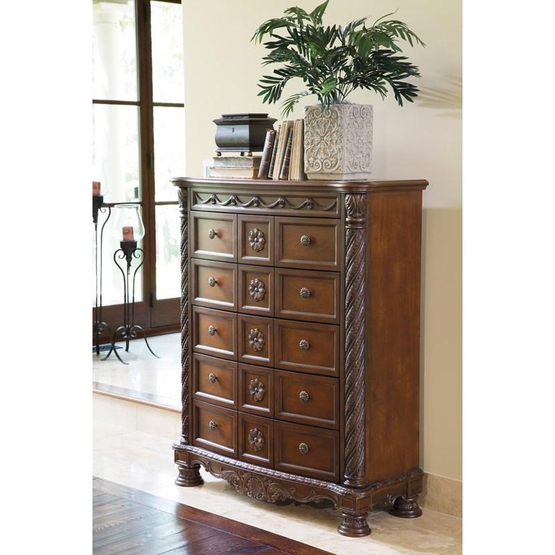 ASHLEY комод NORTH SHORE(коллекция AMERICAN LIFESTYLE).Стиль: американский Traditional.Тип: комод для спальни высокий с пятью выдвижными ящиками,верхний обит фетром.Цвет:тёмно-коричневый.Отделка:кедровый шпон,акцентированные детальные орнаментальные аппликации из литой смолы,антикварная бронзовая металлическая фурнитура.Размеры,мм:ш.1137/г.483/в.1378.