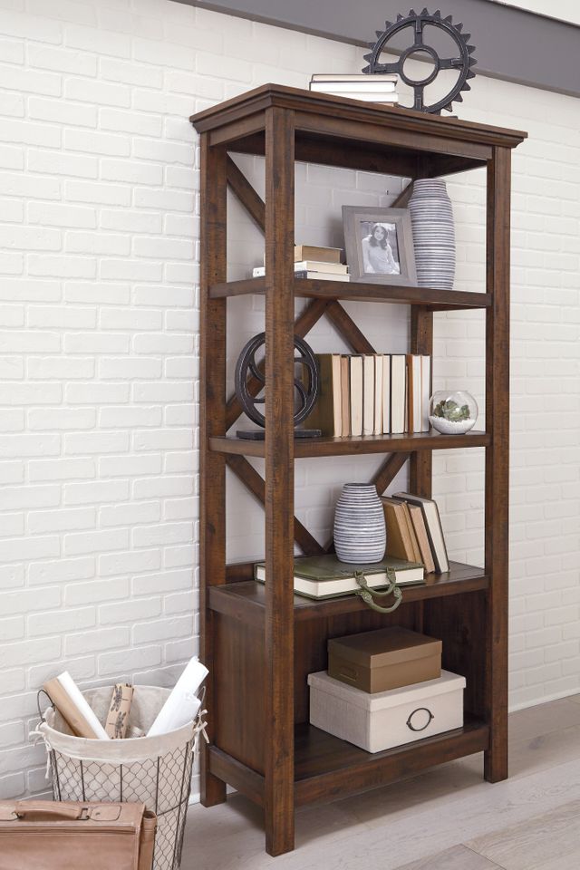 ASHLEY стеллаж BALDRIDGE (коллекция AMERICAN LIFESTYLE).Стиль: американский Casual.Тип: многофункциональный книжный стеллаж с задней панелью в форме косого креста и четырьмя полками,две из них регулируемые.Цвет: коричневый.Отделка: "потёртая"с лёгким дефектом от полотна пилы.Размеры,мм:ш.953/г.407/в.1981.
