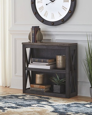 ASHLEY стеллаж средний TYLER CREEK (коллекция AMERICAN LIFESTYLE).Стиль: американский Casual.Тип: многофункциональный стеллаж, с одной центральной регулируемой открытой полкой.Цвет: серо-коричневый/чёрный.Отделка: двухцветная текстурная; искусственно состаренный шпон дуба; дощатая столешница.Размеры,мм:ш.750/г.300/в.760.