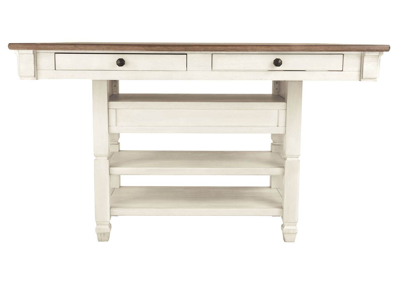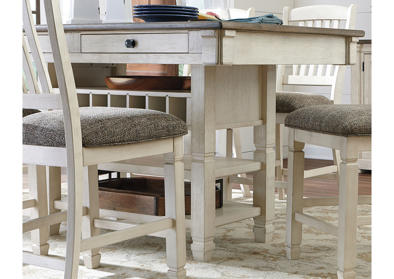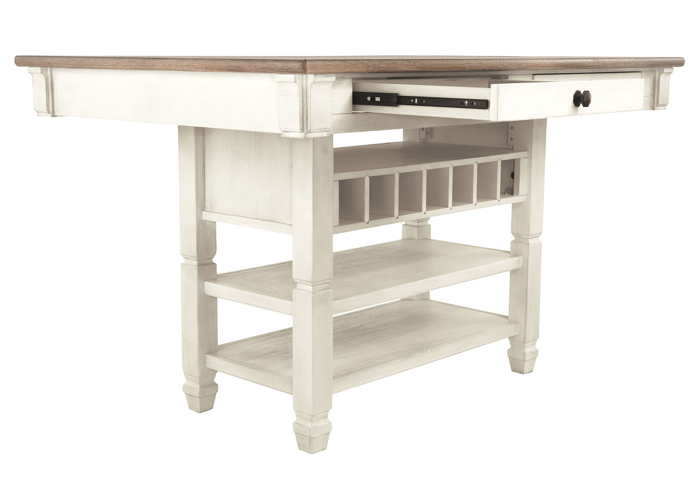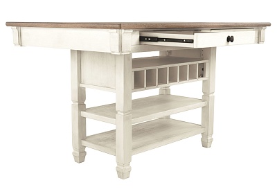 ASHLEY стол BOLANBURG( коллекция AMERICAN LIFESTYLE).Стиль: американский Vintage Casual( Mane+Mason).Тип: высокий прямоугольный барный стол на шесть персон, с четырьмя выдвижными ящиками( по два с каждой стороны),тремя фиксированными полками,одна из них винная( хранение до семи бутылок).Цвет: белый,коричневый.Отделка:текстурная двухцветная,искусственно состаренная,дощатый эффект столешницы,дубовый шпон,антикварная металлическая фурнитура.Размеры,мм: ш.1524/г.1016/в.921.