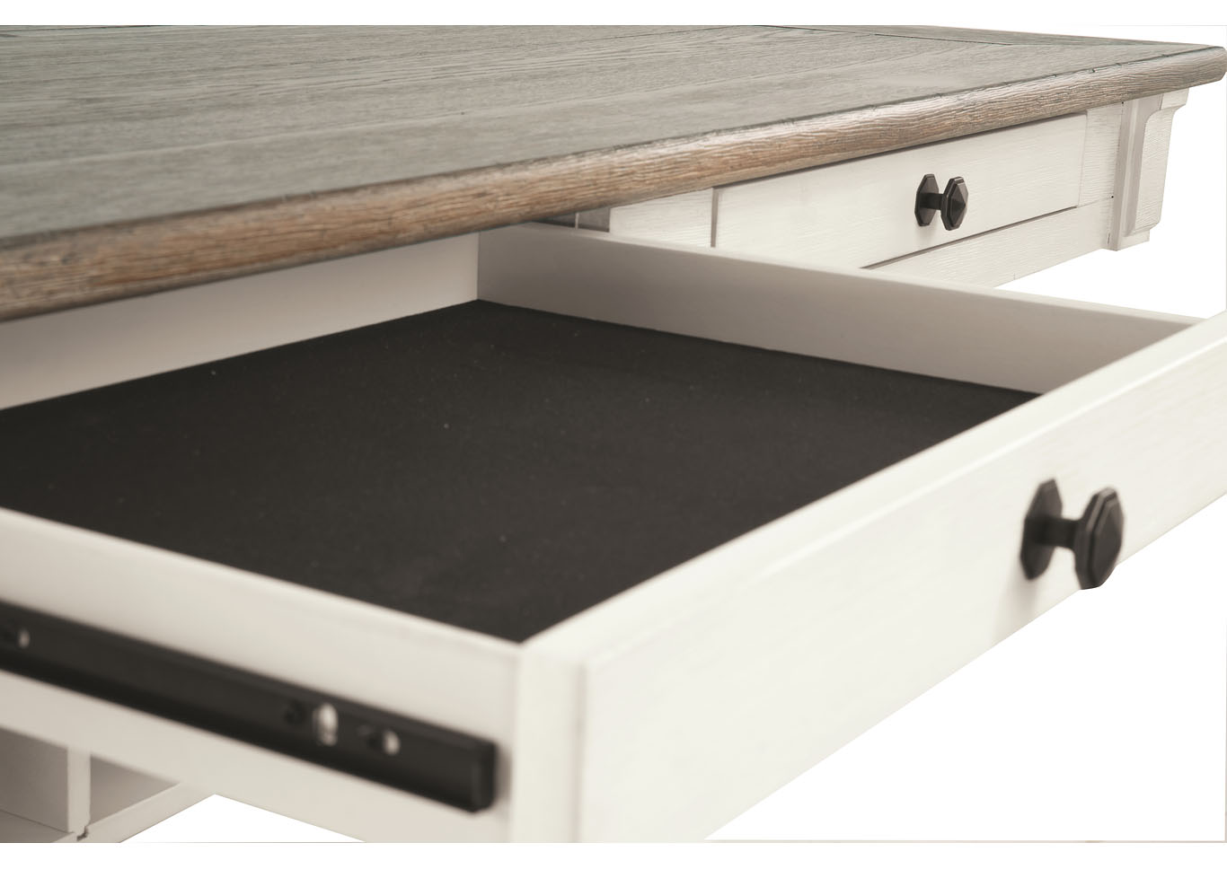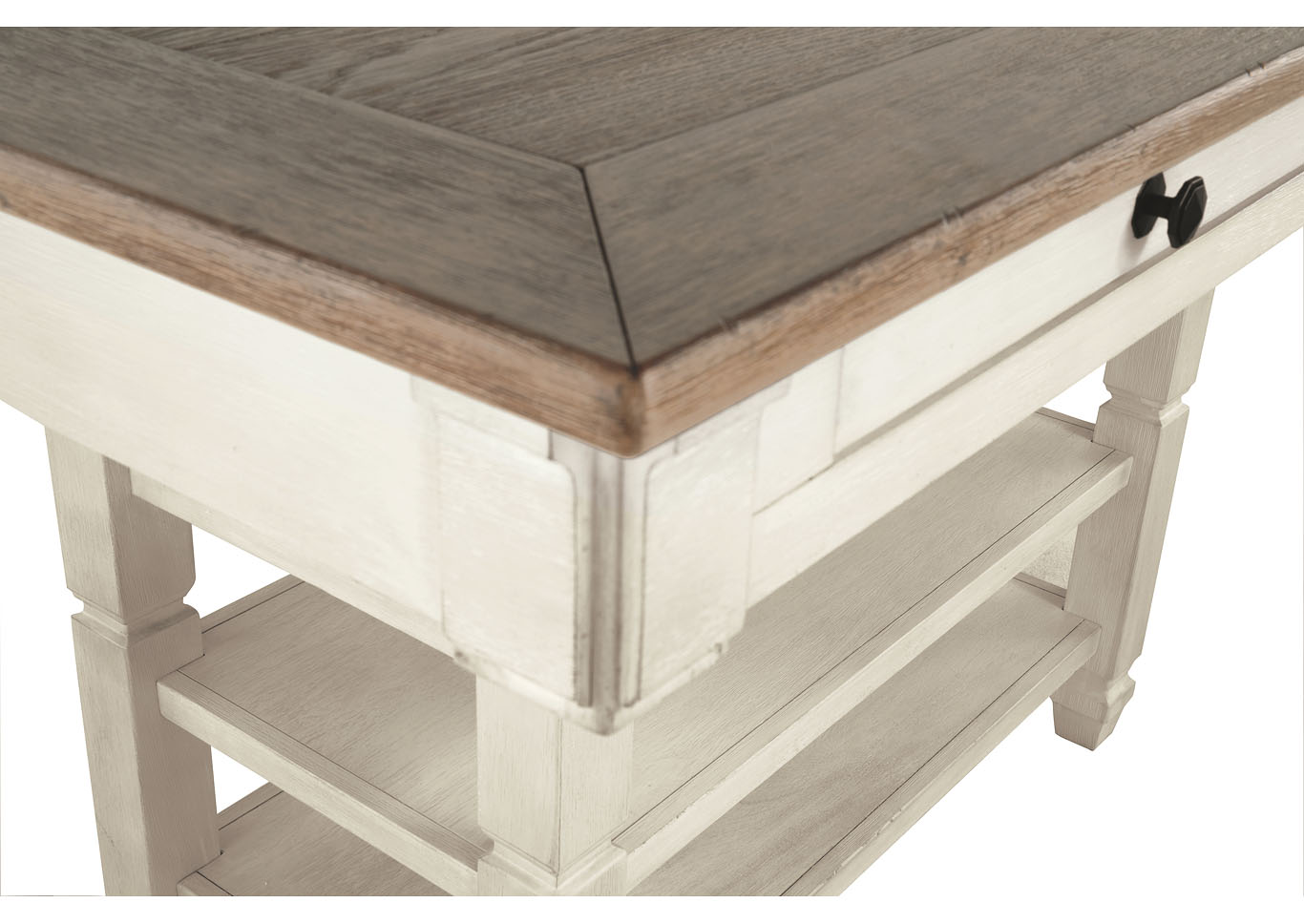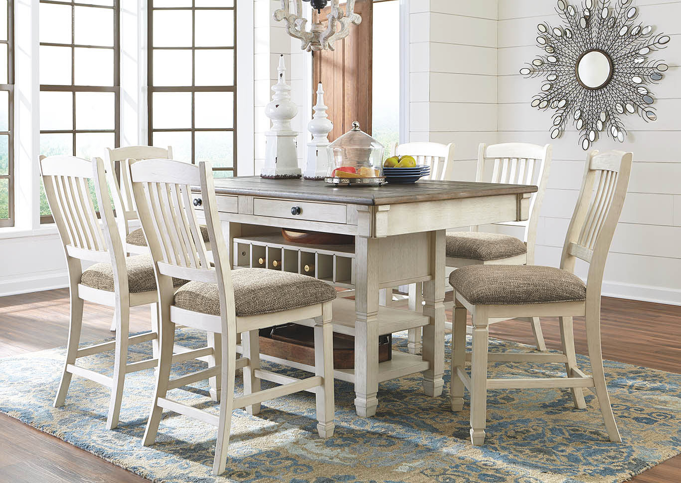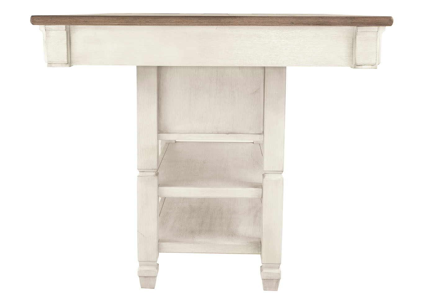 ASHLEY стол BOLANBURG( коллекция AMERICAN LIFESTYLE).Стиль: американский Vintage Casual( Mane+Mason).Тип: высокий прямоугольный барный стол на шесть персон, с четырьмя выдвижными ящиками( по два с каждой стороны),тремя фиксированными полками,одна из них винная( хранение до семи бутылок).Цвет: белый,коричневый.Отделка:текстурная двухцветная,искусственно состаренная,дощатый эффект столешницы,дубовый шпон,антикварная металлическая фурнитура.Размеры,мм: ш.1524/г.1016/в.921.